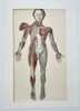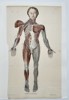 This anatomical illustration (Plate XVII) displays a full human figure standing in the anatomical position, with the superficial layers of the body partially dissected to reveal the underlying structures. The right side of the body emphasizes the musculature and superficial vasculature (arteries and veins), while the left side focuses on the skeletal structure (rib cage and bone outlines) and nervous system, showing the interplay between different organ systems. Hilmar Johannes Backer was a Danish surgeon and professor of anatomy, renowned for his contributions to anatomical education and illustration. The style and detail of this lithograph suggest it was created for an atlas or textbook, often translated and adapted across Europe, to provide students and practitioners with a clear, color-coded visual guide to human anatomy.