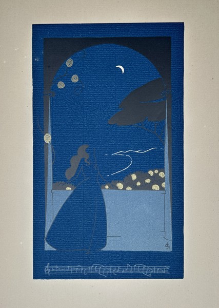 This highly decorative color illustration depicts a solitary female figure in a long gown, viewed in silhouette, gazing out from an arched frame at a nocturnal landscape under a crescent moon. The scene is rendered in flat fields of deep blue, black, and gray tones, emphasizing the moody, dreamlike quality characteristic of Symbolism and Art Nouveau. The border below the figure contains printed musical notation, suggesting the work was originally related to a piece of sheet music or a musical publication.