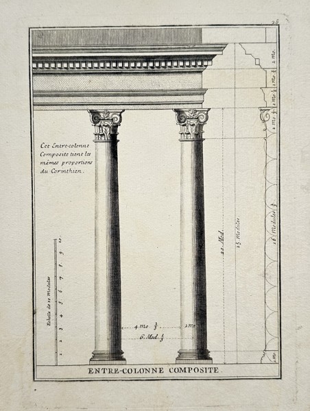 This detailed technical illustration showcases the design and proportional measurements of the Composite order, focusing specifically on the spacing between two columns (intercolumniation) and the structure of the entablature above. The Composite capital, which combines elements of the Ionic and Corinthian orders, is clearly displayed. The print includes proportional measurements and notations to guide architects and builders. This plate was published in a French edition of the influential treatise, Regola delli cinque ordini d'architettura.