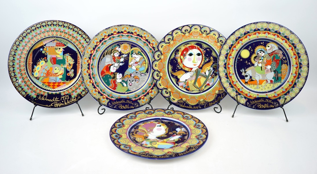 Auktioner Björn Wiinblad, jultallrikar, 5 st, porslin, ''Weinachtsteller'', Studio-Line, Rosenthal, Tyskland, 1973-1980.