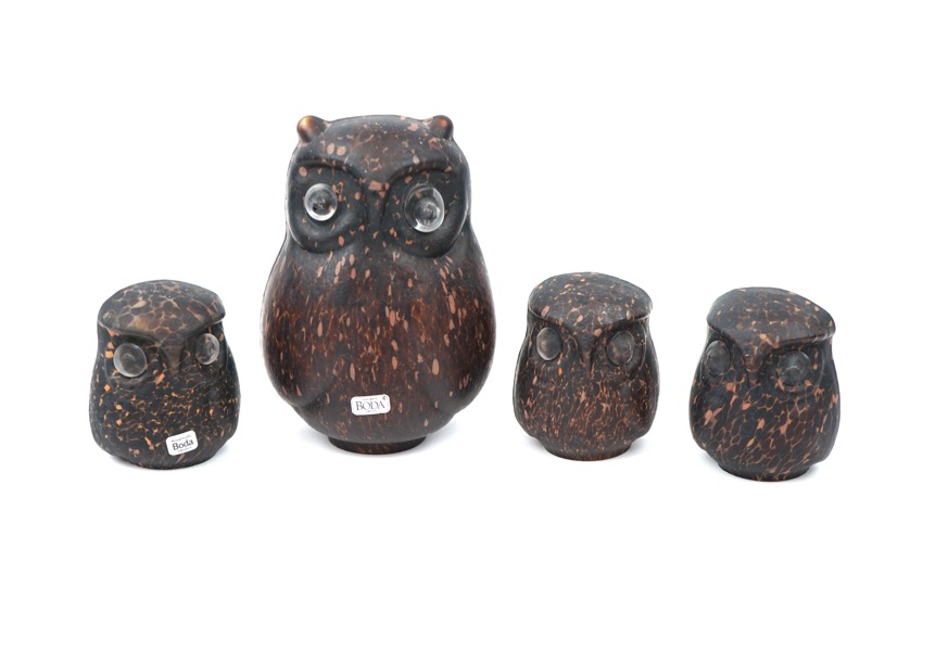 Monica Backström, figuriner, 4 st, ugglor, glas, Boda.