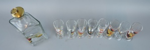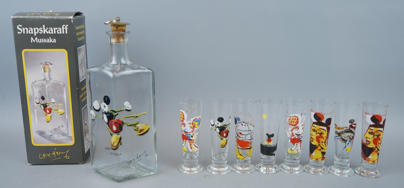 Lasse Åberg, snapskaraff och snapsglas, 9 delar.
