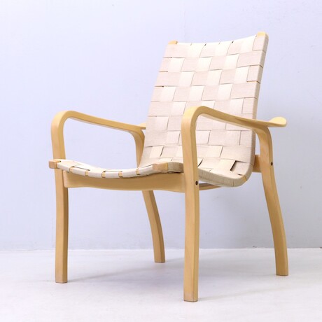 Bilder Karmstol Swedese Primo. Yngve Ekström. Böjträ och sadelgjord. 78x58x68.
