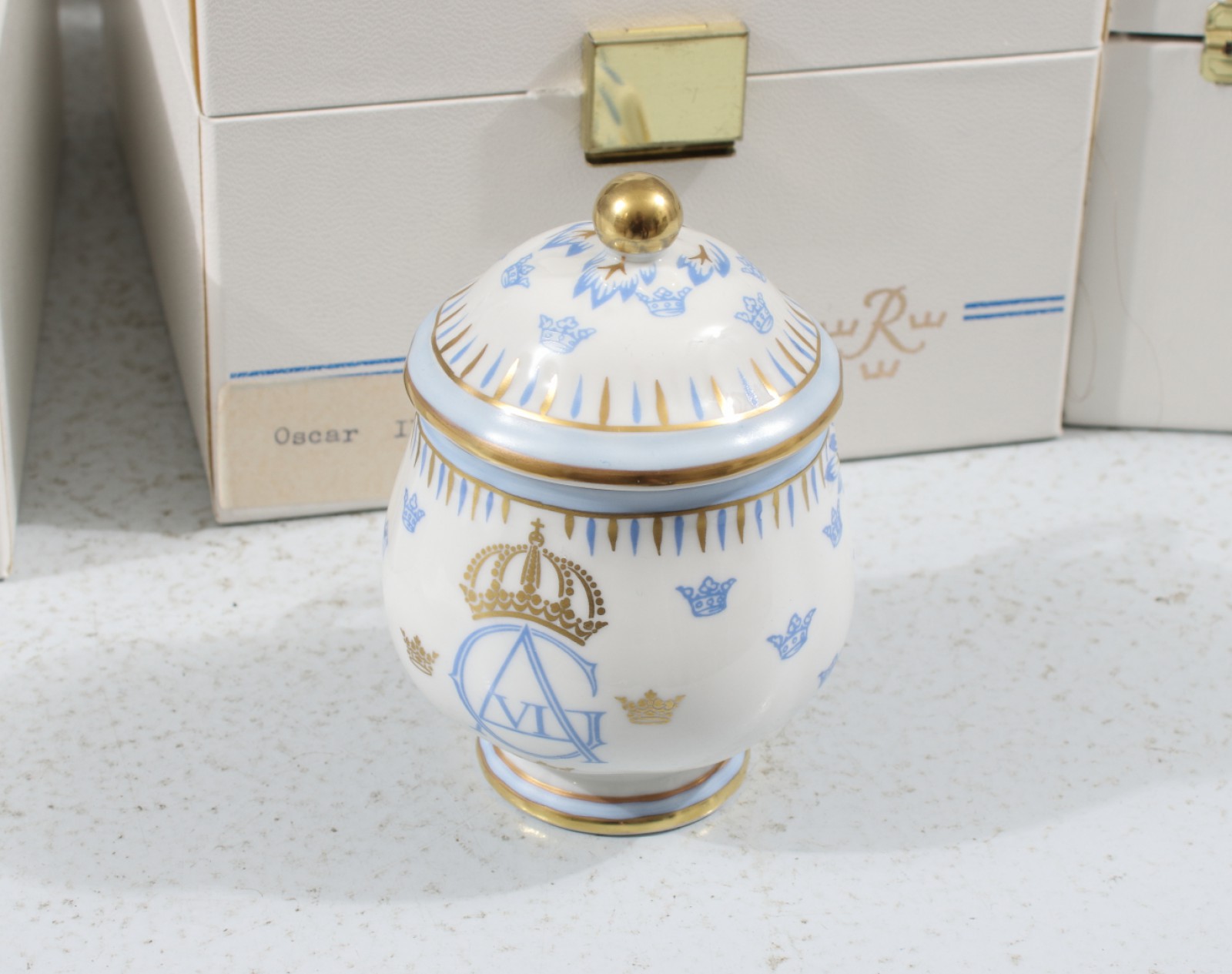12 stycken (komplett), porslin, dekor i blått och guld med inspiration efter Gripsholmsservisen, dekor med svenska kungars namnschiffer och valspråk, originalboxar medföljer, kopp höjd ca 9,5 cm diameter ca 5,5 cm, fat diameter ca 12 cm. (vån3)