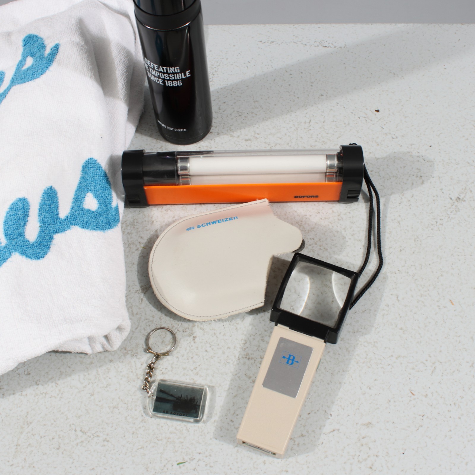 5 delar, handduk, nyckelring, ficklampa, termos och förstoringsglas. (vån3)