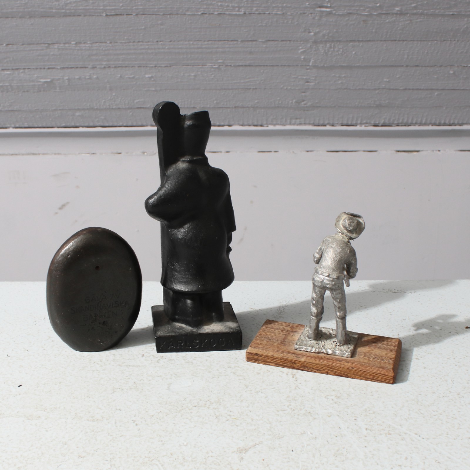 3 stycken, olika material, 1st "Smégubbe" av Bergmans gjuteri, Karlskoga, 1st Stig Blomberg för Skandinaviska Banken samt 1st "Bergslagsgubben", höjd 10-20 cm. (vån)