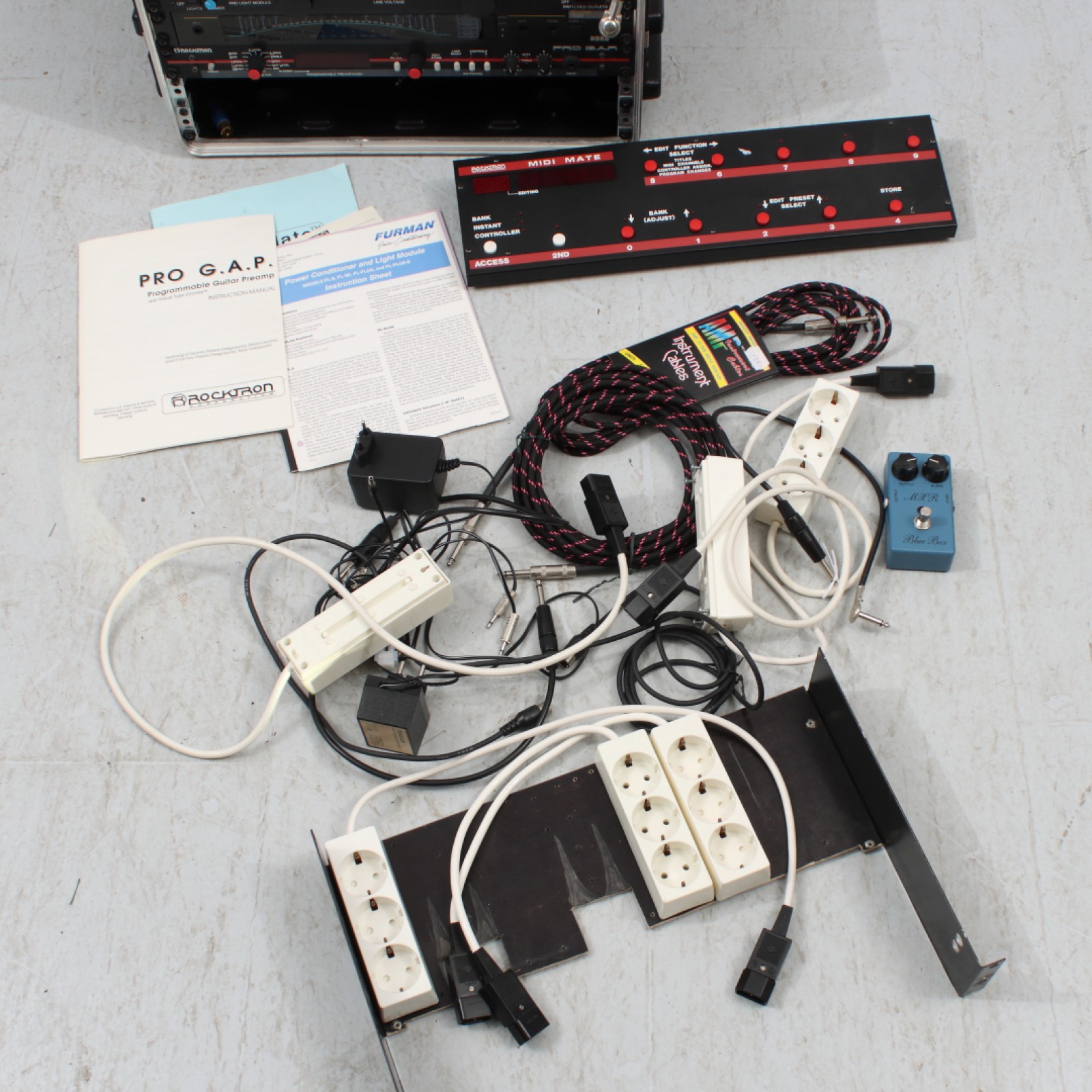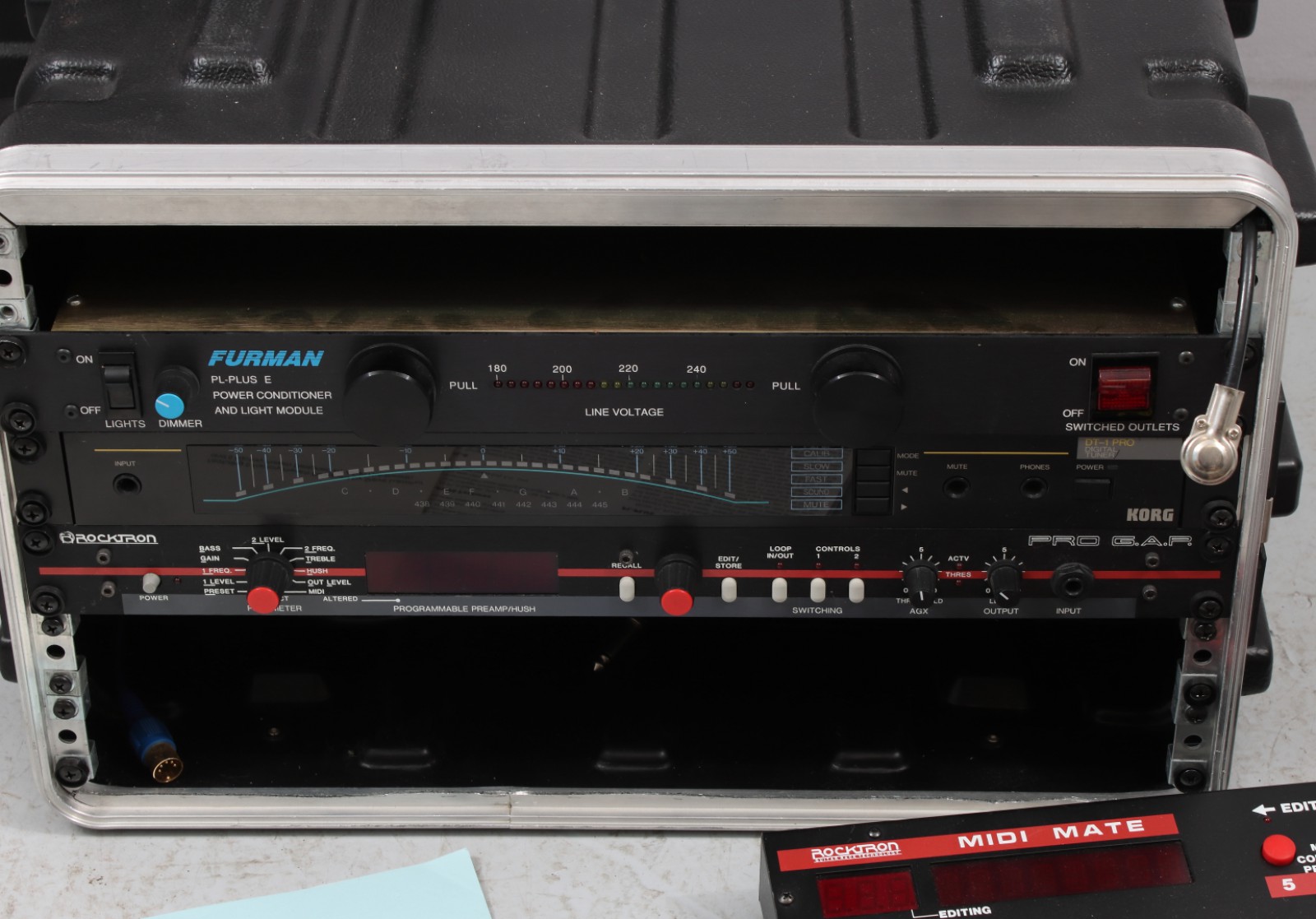 Rack med Furman ljusmodul, Korg stämappartat, Rocktron Pro-Gap samt Rocktron Midi Mate, case 32x55x52 cm. (vån2)
