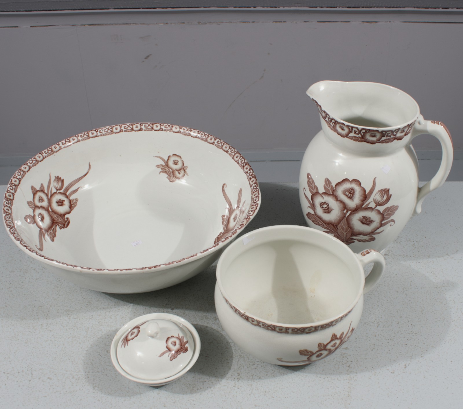 4 delar, Rörstrand "Tuna", vattenkanna, tvättfat, potta samt tvålgat med lock, 1900-talets första hälft, Obs! tvättfat samt lock till tvålfat med sprickor (se bilder), höjd vattenkanna 27 cm, diameter tvättfat 41 cm. (vån3)