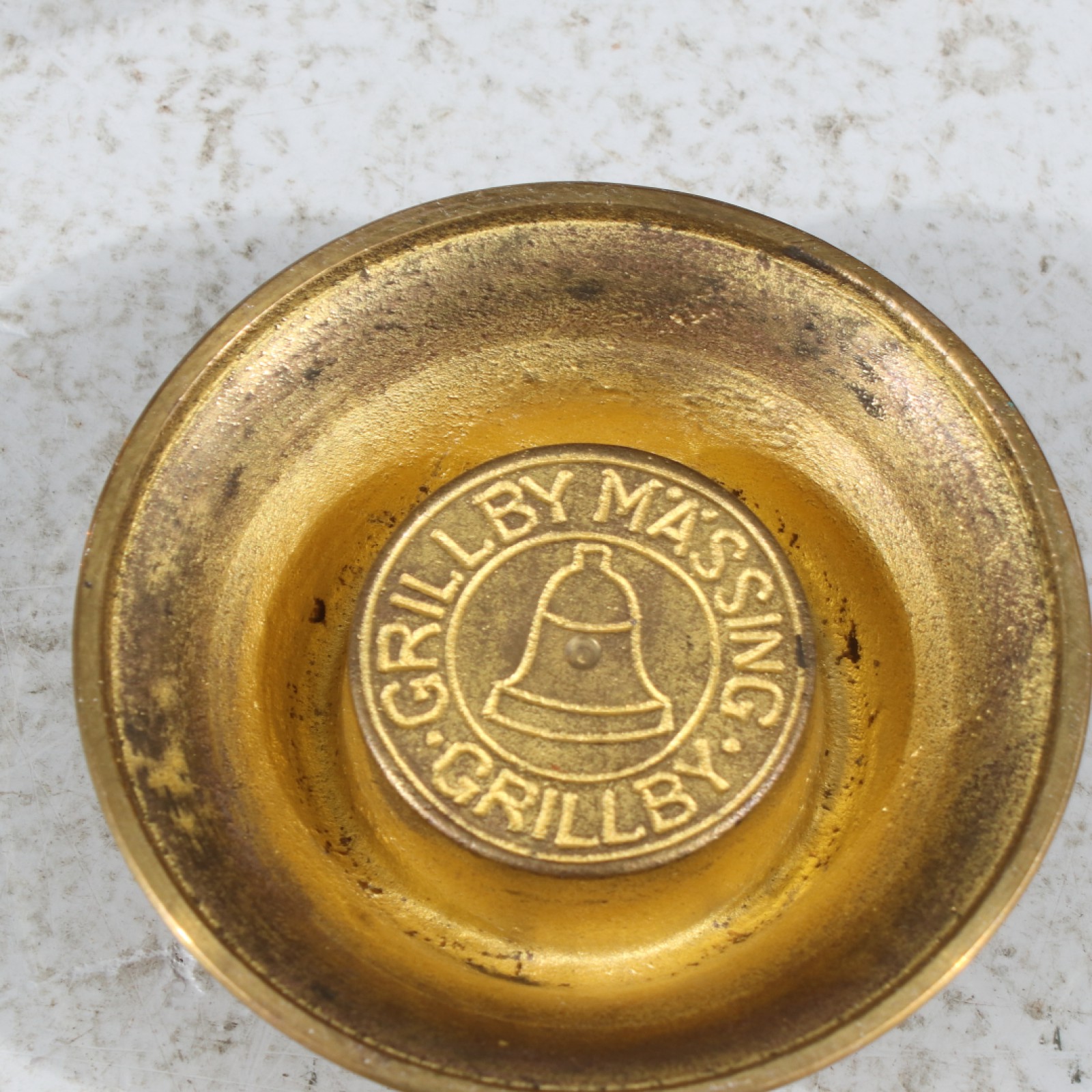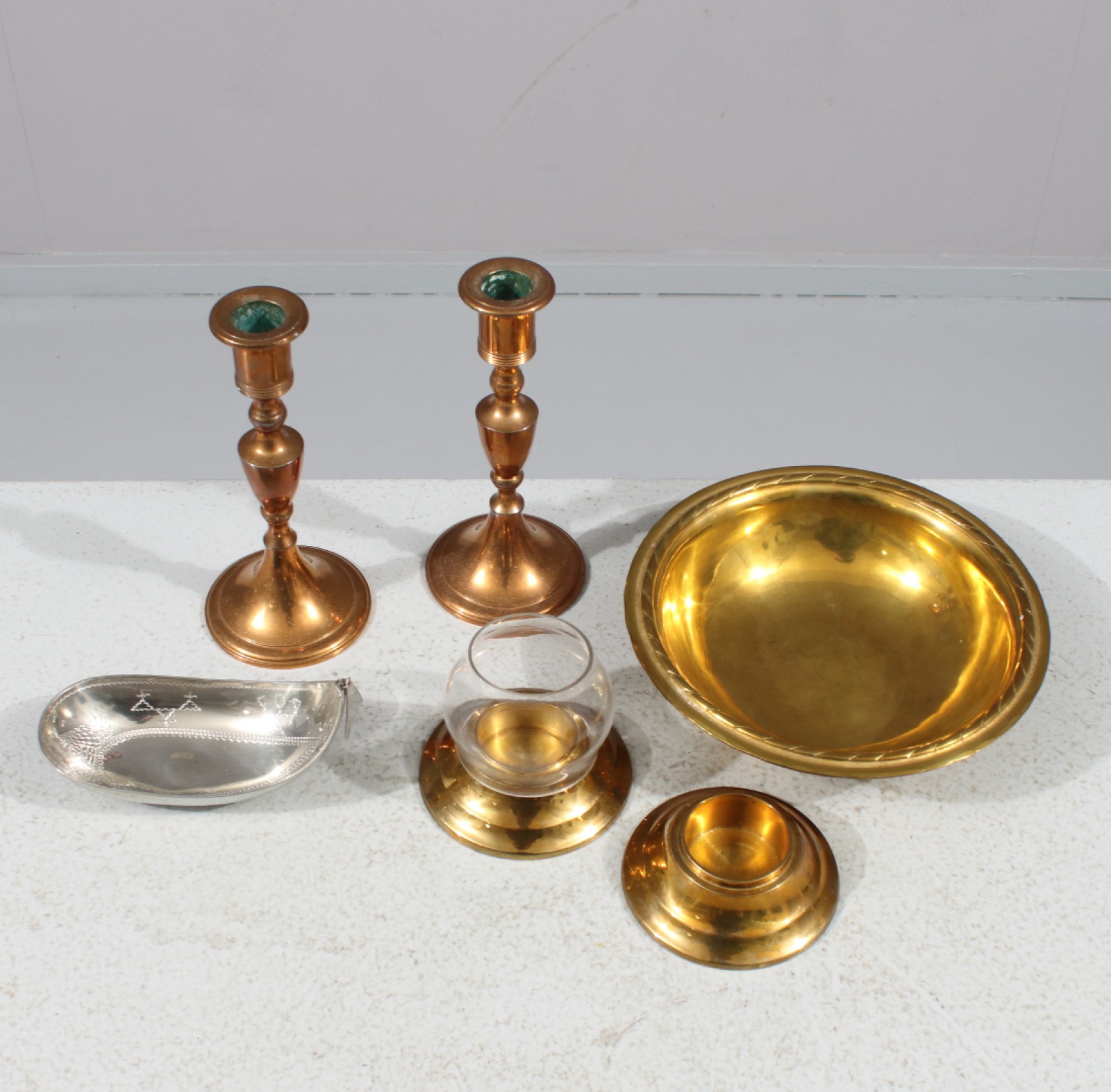 6 delar, 1 par ljusstakar i malm, 1st Kopparsmedjan Eskilstuna "Skål" i mässing, 1st skål/kåsa i tenn samt 2st ljuslyktor Grillby (1st saknar glasskärm), höjd 16 cm och lägre, diameter skål 18 cm. (vån3)