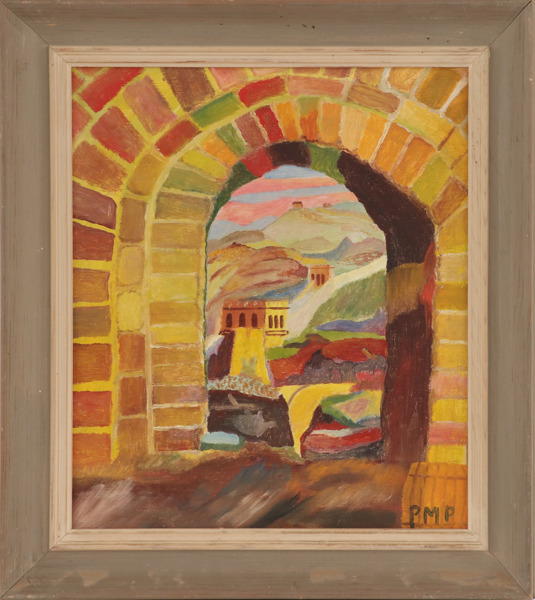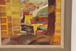 Olja på pannå, landskap med byggnader. Monogramsignerad.