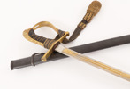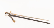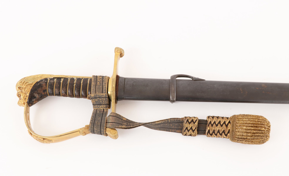 Handtag i förgylld mässing, med dekor av lejonhuvud och Tre Kronor. Svärtad stålbalja. Klinga stämplad E.Svalling Eskilstuna, med förgylld och etsad dekor.