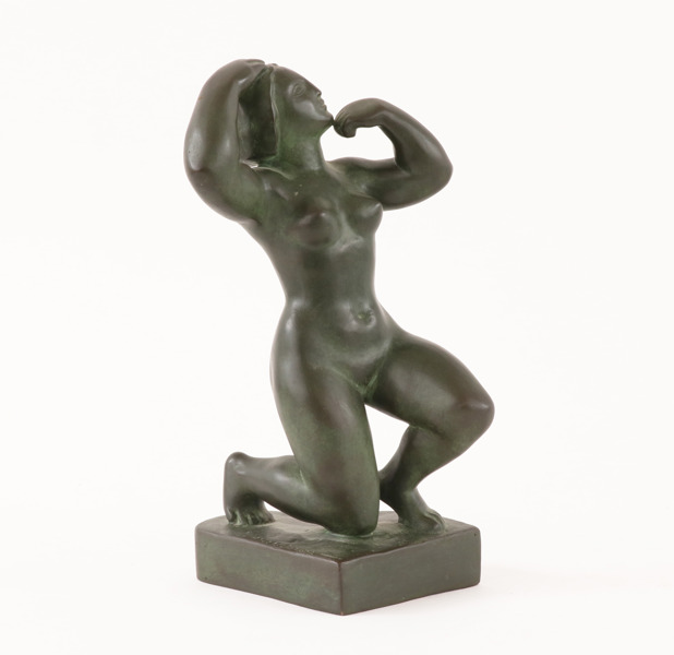 Skulptur i patinerad brons. Poserande kvinna. Signerad. Gjutarstämpel Otto Meyer eftr. fud.