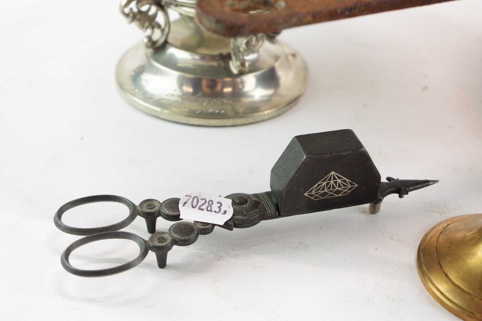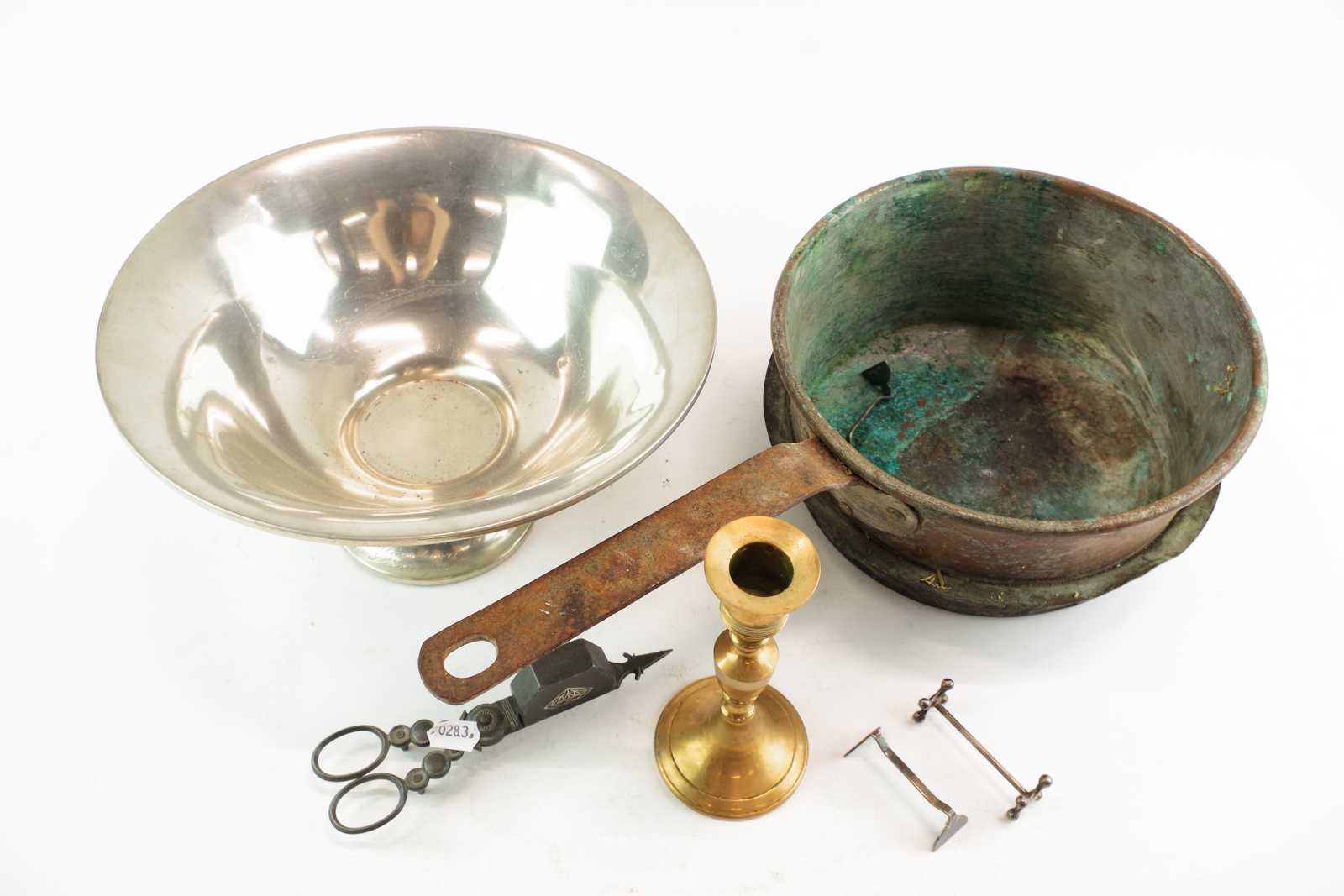 Bilder LJUSSTAKE malm H:14,5 cm, LJUSSAX, TENNSKÅL, KOPPAR GRYTA (defekter)