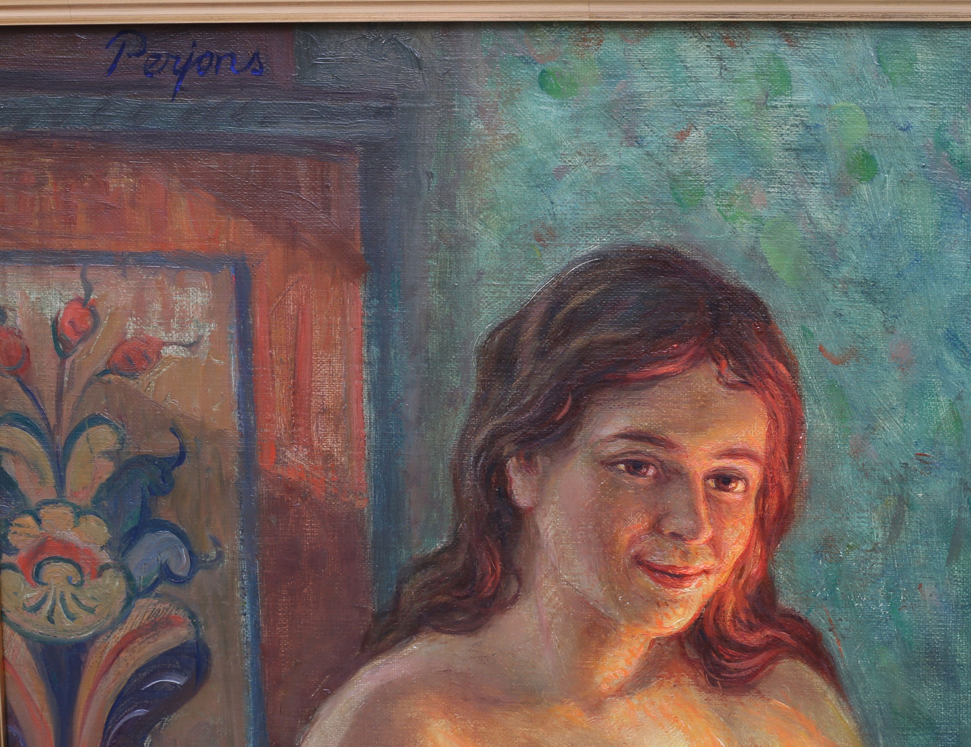 oljemålning på duk, sittande naken kvinna framför brasan, signerad även atergo nr. 11-87 Dala-Floda, 55x46, rammått 70x61