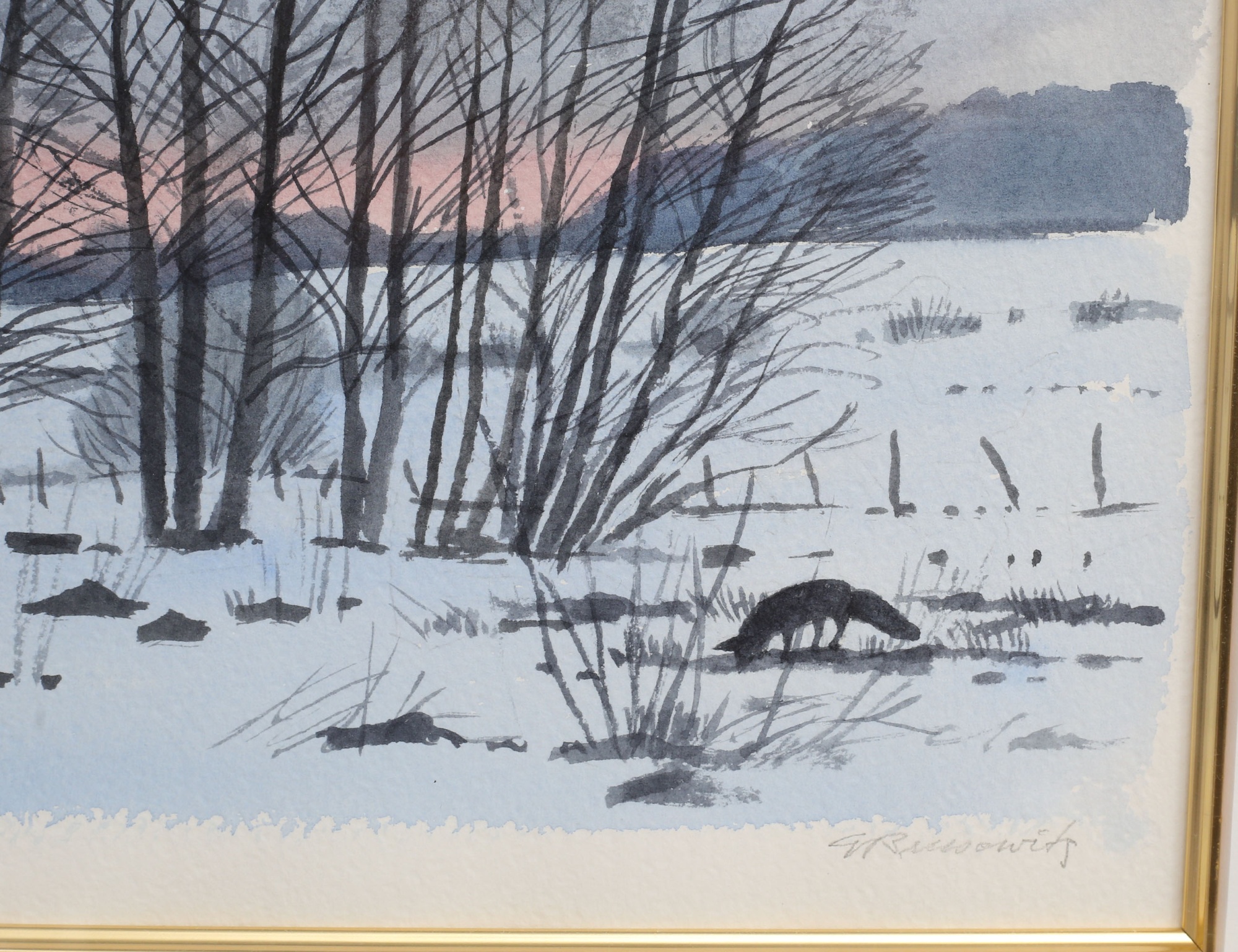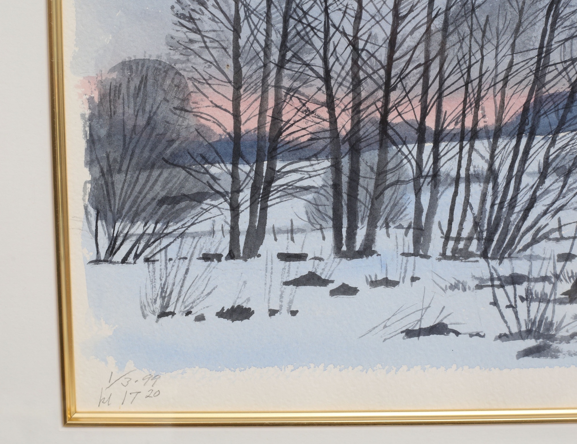 akvarell, solnedgång med räv i vinterlandskap, signerad 1/3-99 kl. 17:20, bildmått 21x29, rammått 41x49