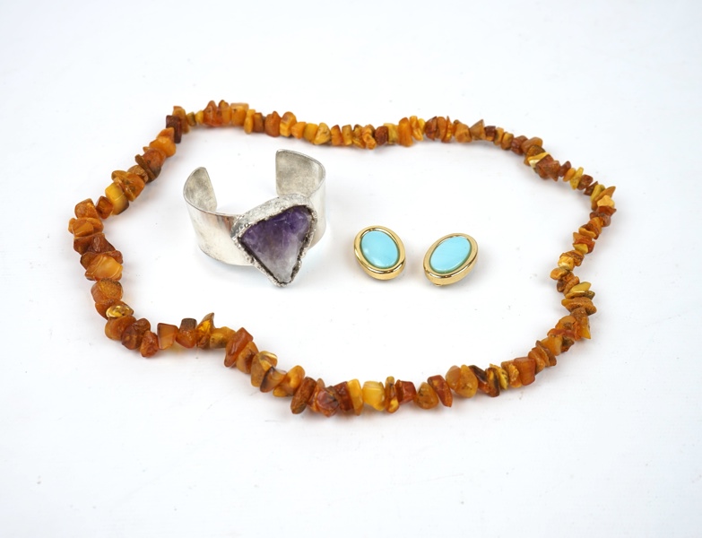 Halsband, armband, örhängen, 4 delar, bl.a bärnsten.