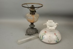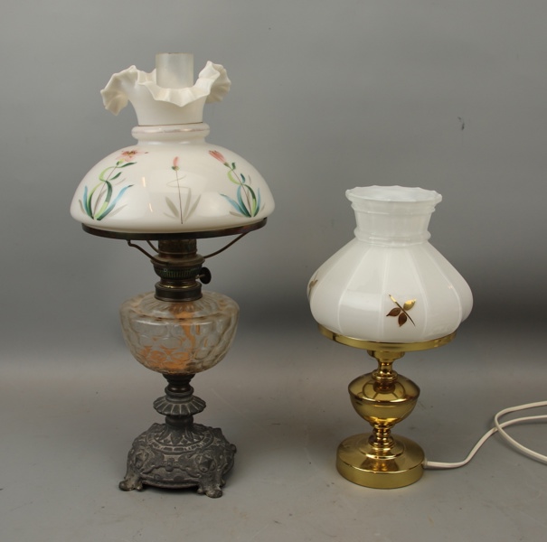 Bordsfotogenlampa och bordslampa, glas/metall, 1900-tal.