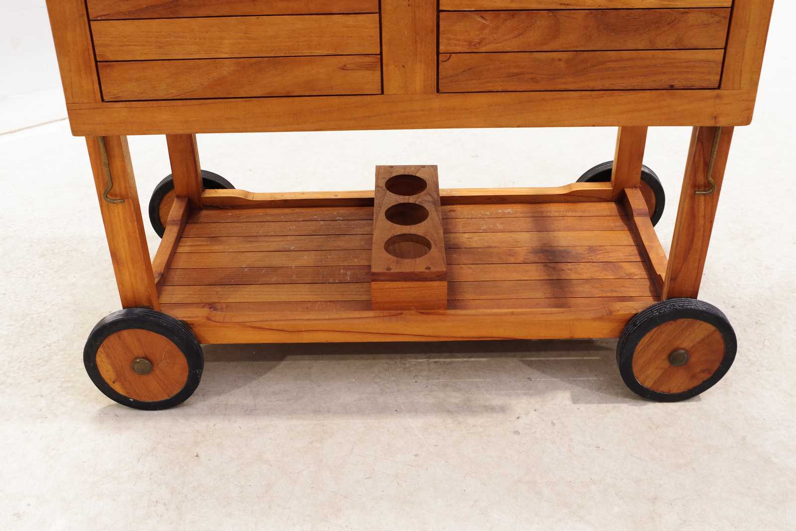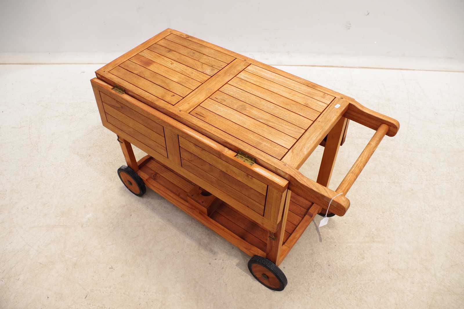 Bilder TRÄDGÅRDSBORD teak 2000-tal. H:77x 43x 108cm exkl. klaffar. Några hjul rullar trögt.