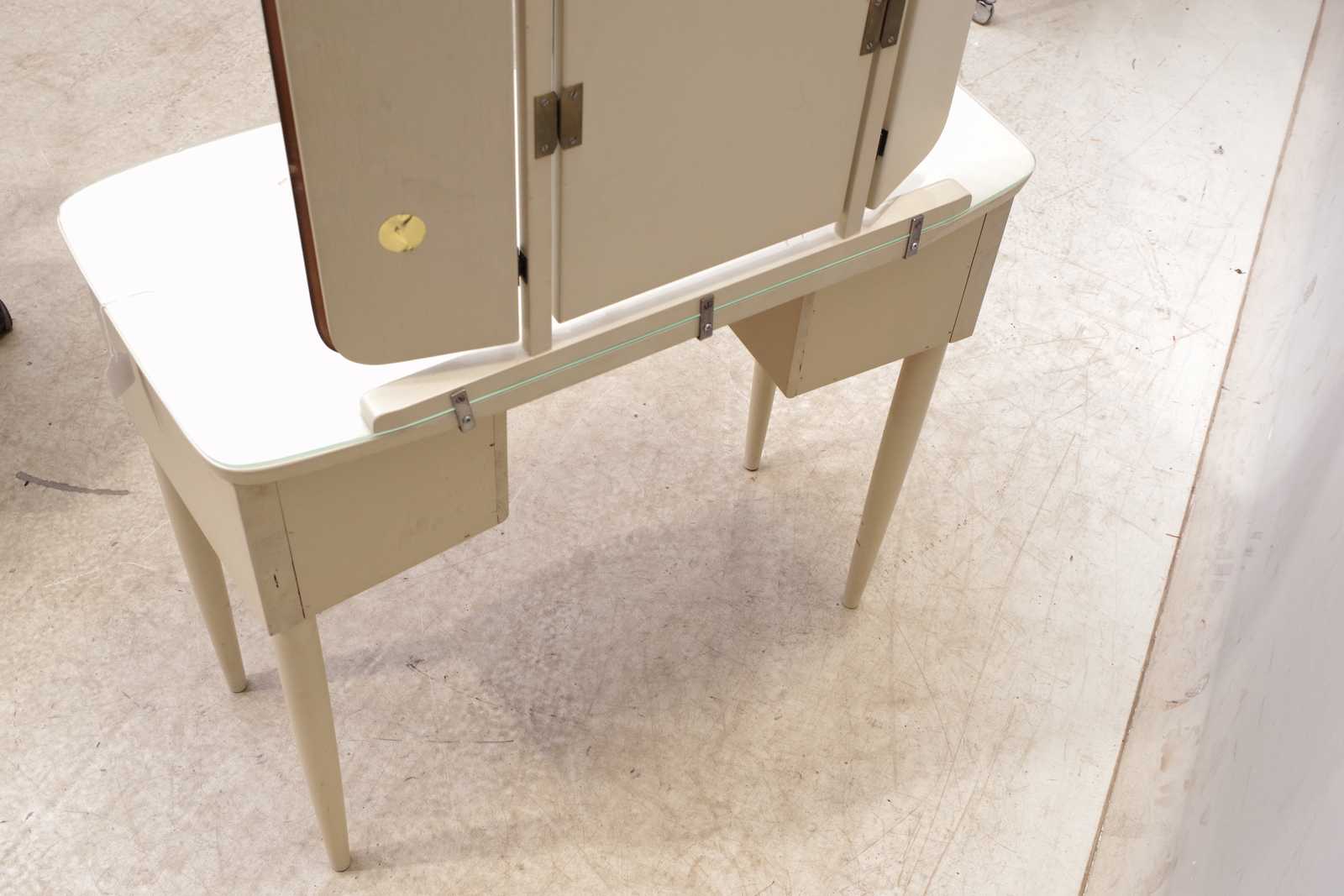Auktioner SMINKBORD omkring 1900-talets mitt. H:119x 84x 40cm. Aningen ranglig och nagg i glasskivan.