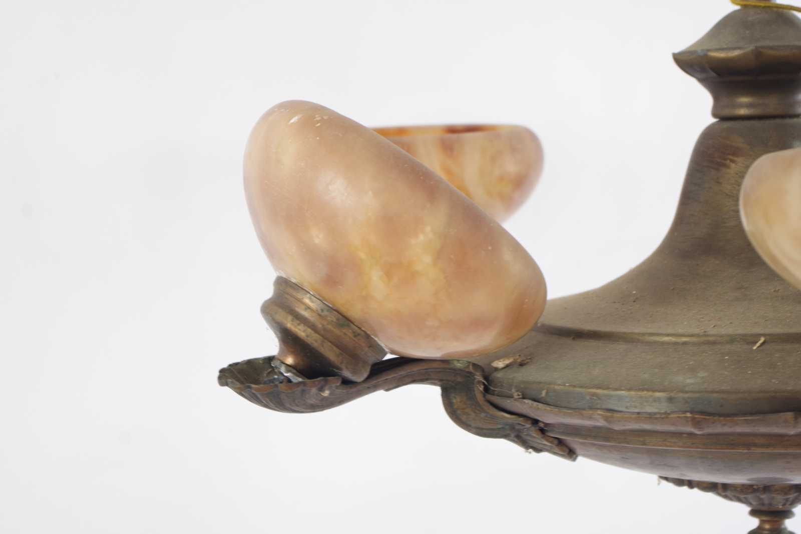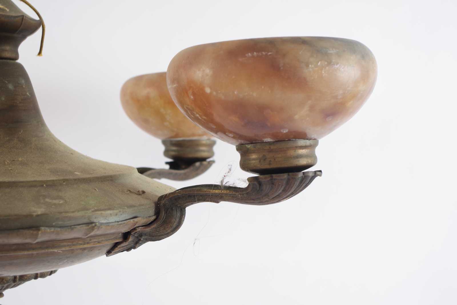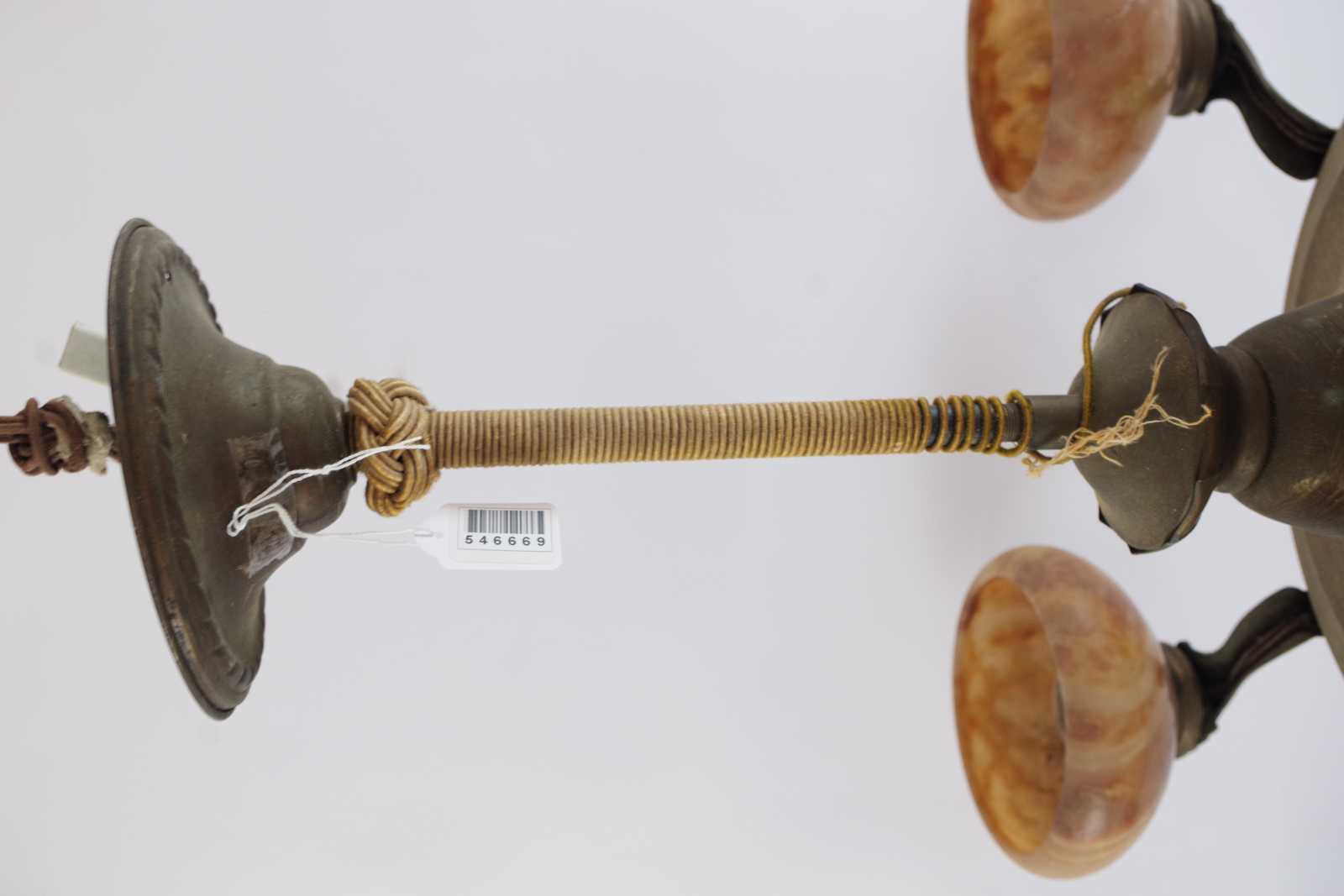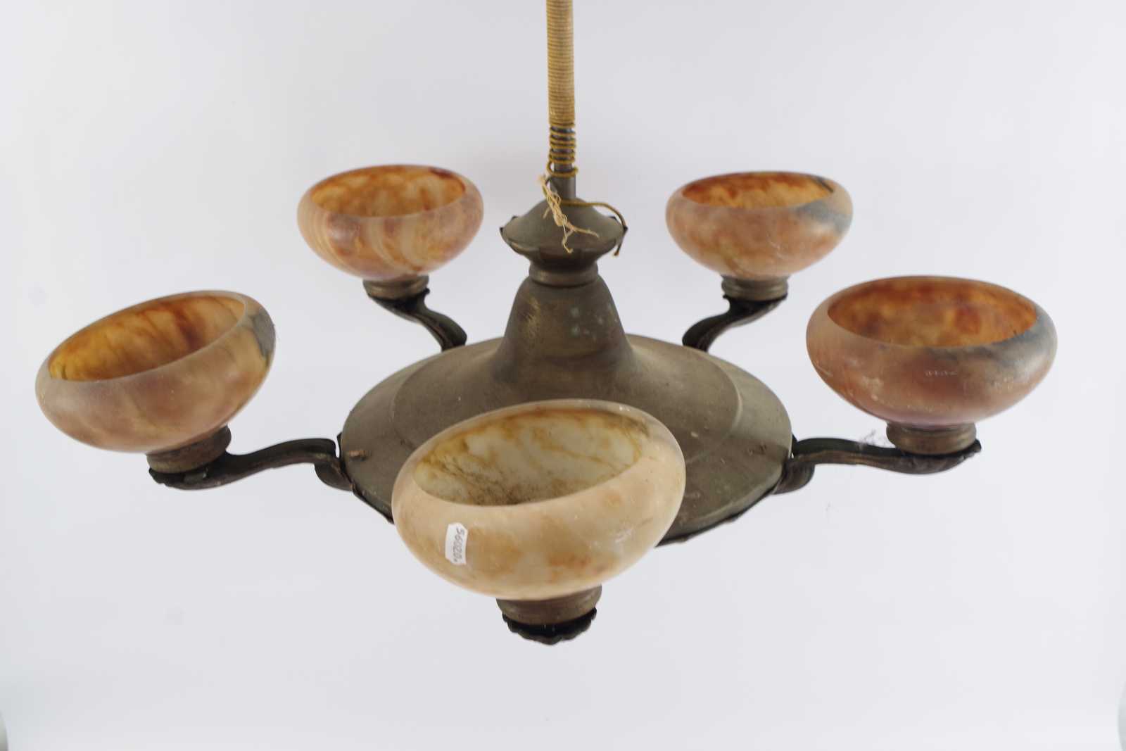 Bilder TAKLAMPA Art Deco, 5 armar, kupor i glas, stomme i metall. D:68cm H:55cm (fäste till en lampa trasigt, slitage)