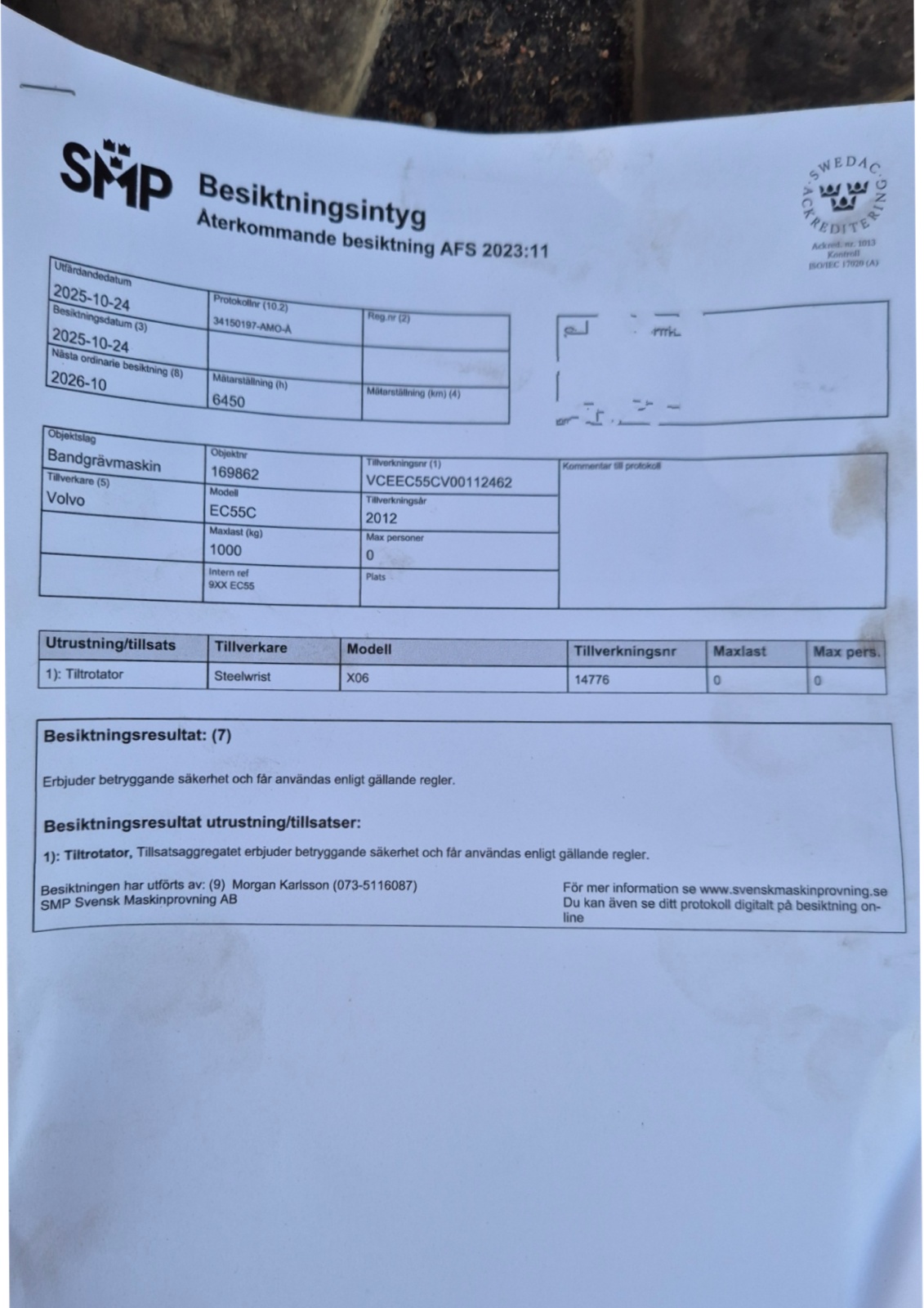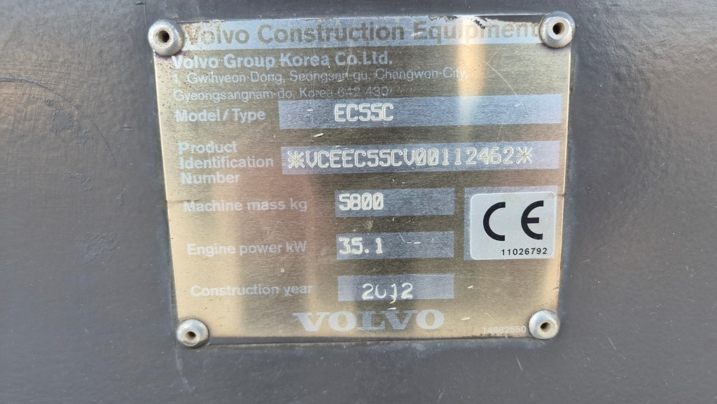Märke/Modell: Volvo EC55CÅrsmodell: 2012Mätarställning: 6456 timmarMaskinvikt: 5800 kgRedskapsfäste: S40