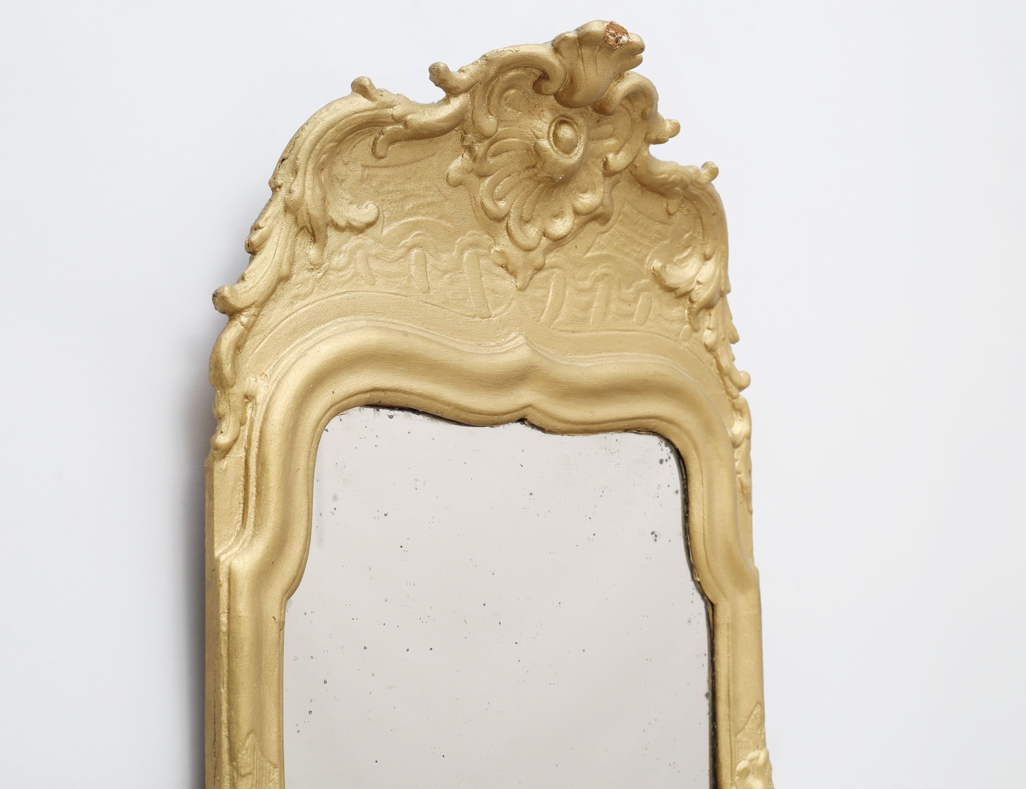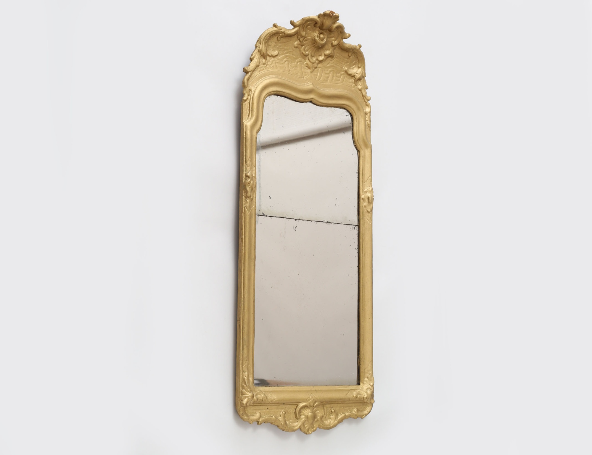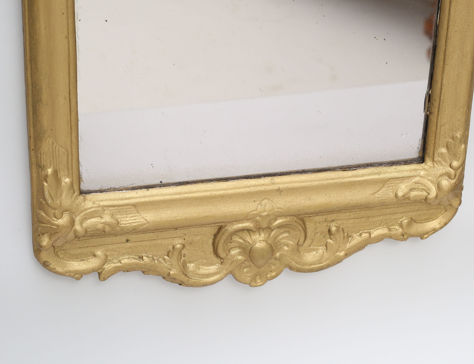sannolikt Stockholmsarbete, träskuren dekor, uppsvängt krön med rocaille, tvådelat samtida glas, senare bronsering, 101x40 (krön med mindre avslag)