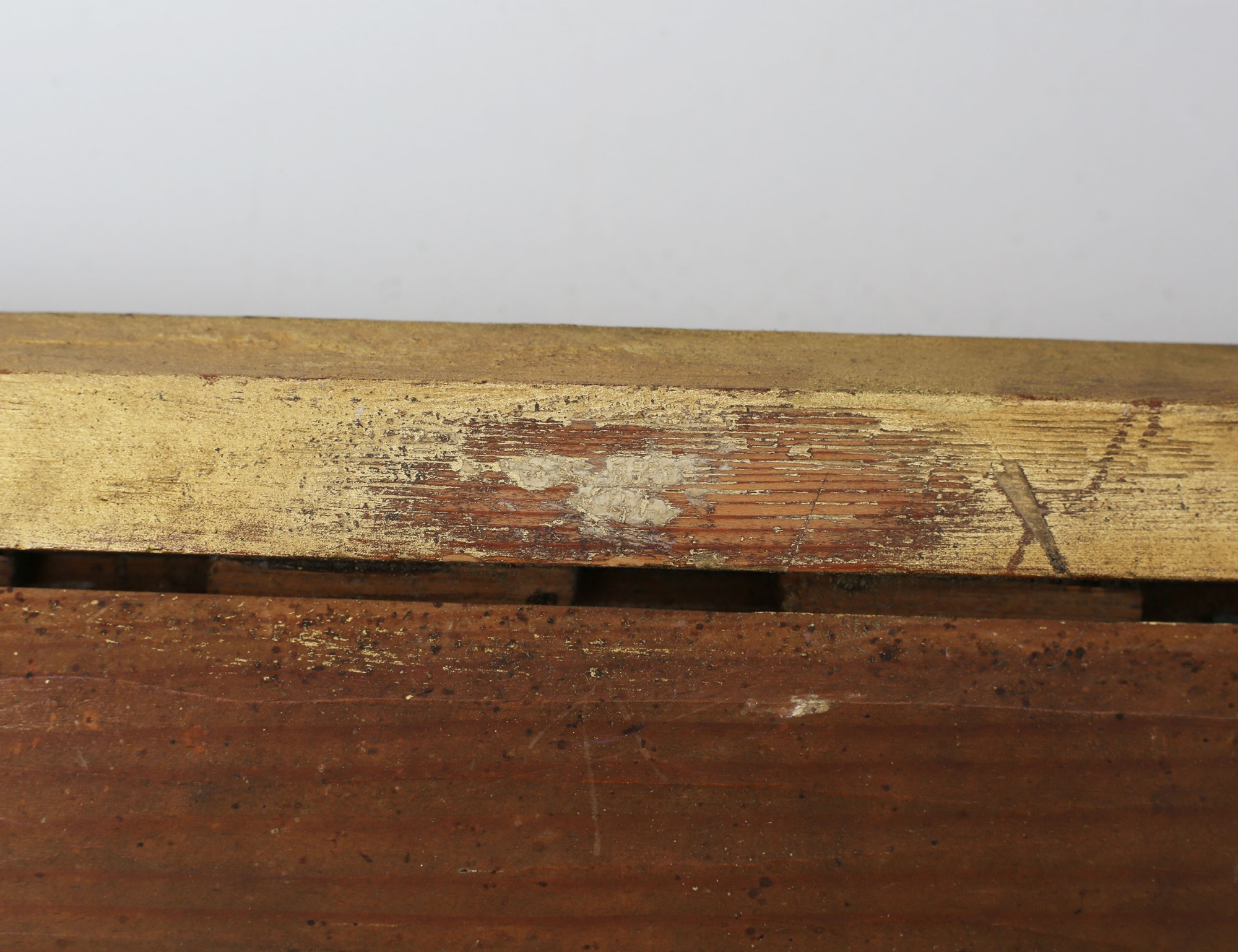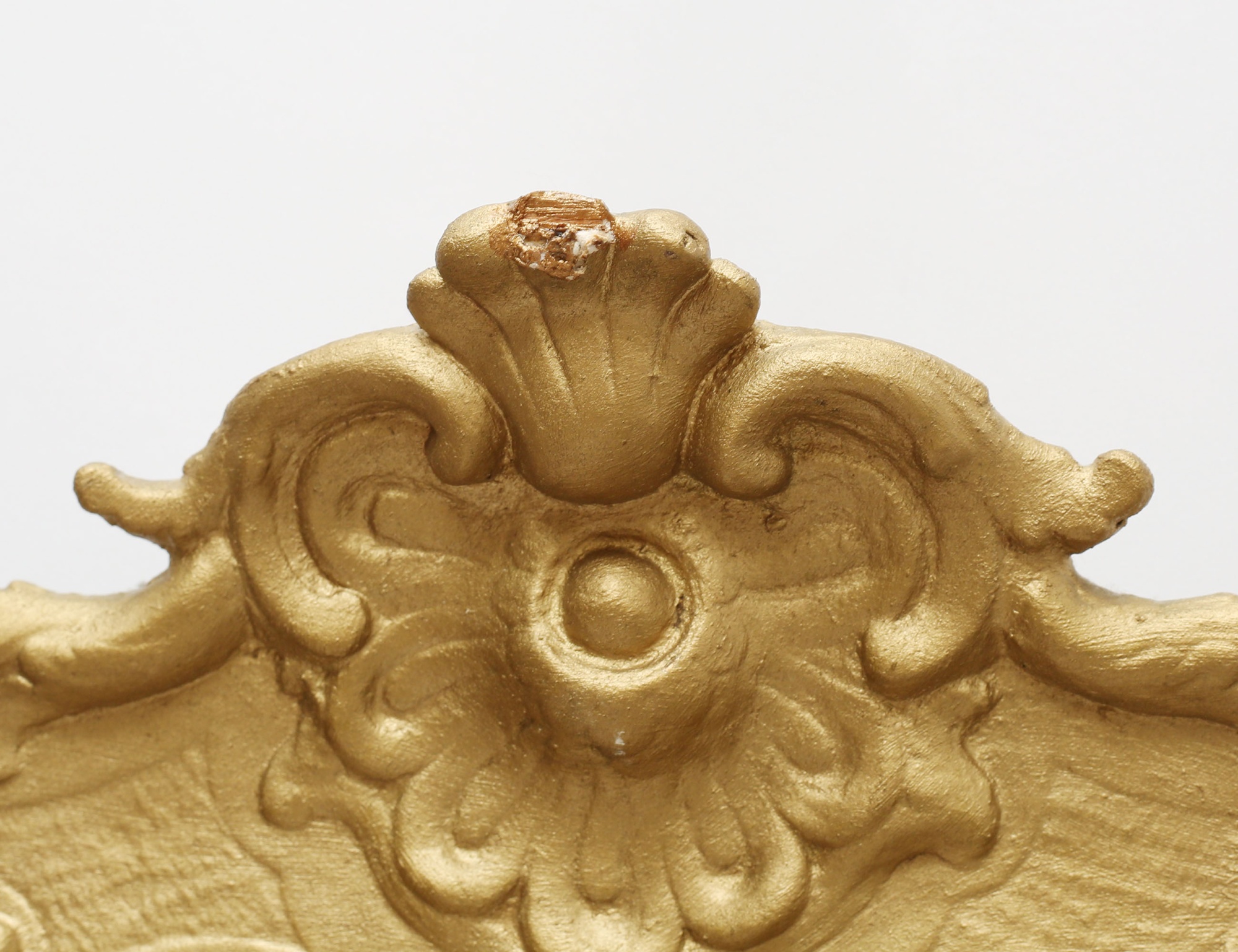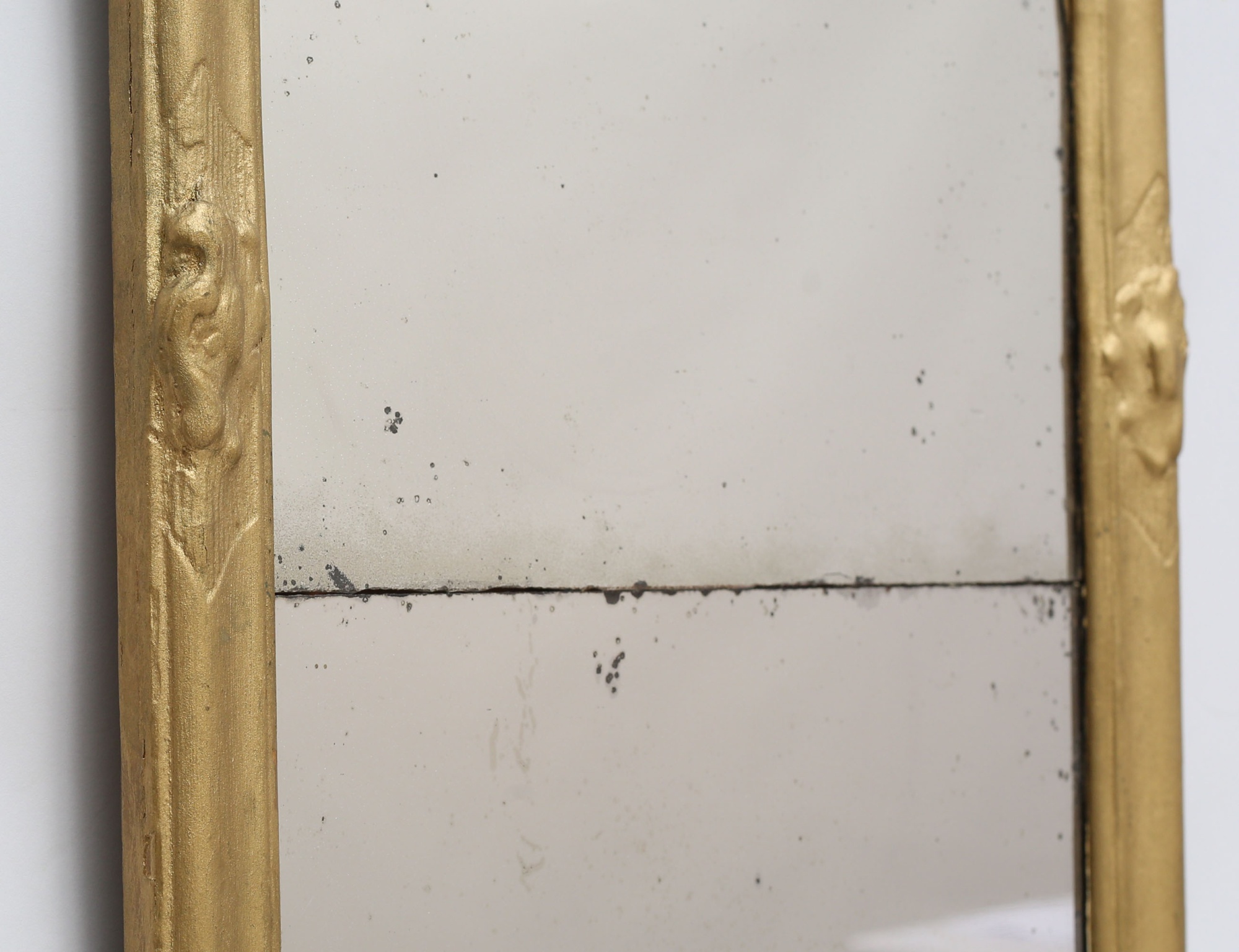 sannolikt Stockholmsarbete, träskuren dekor, uppsvängt krön med rocaille, tvådelat samtida glas, senare bronsering, 101x40 (krön med mindre avslag)