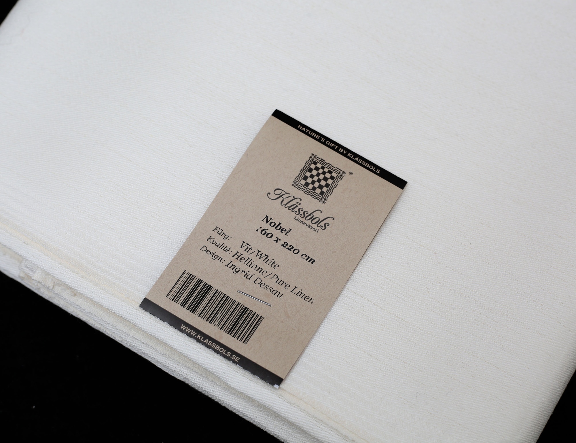 Klässbols linneväveri, hellinne, drällteknik, designad 1991, ocirkulerad i originalkartong, 220x160