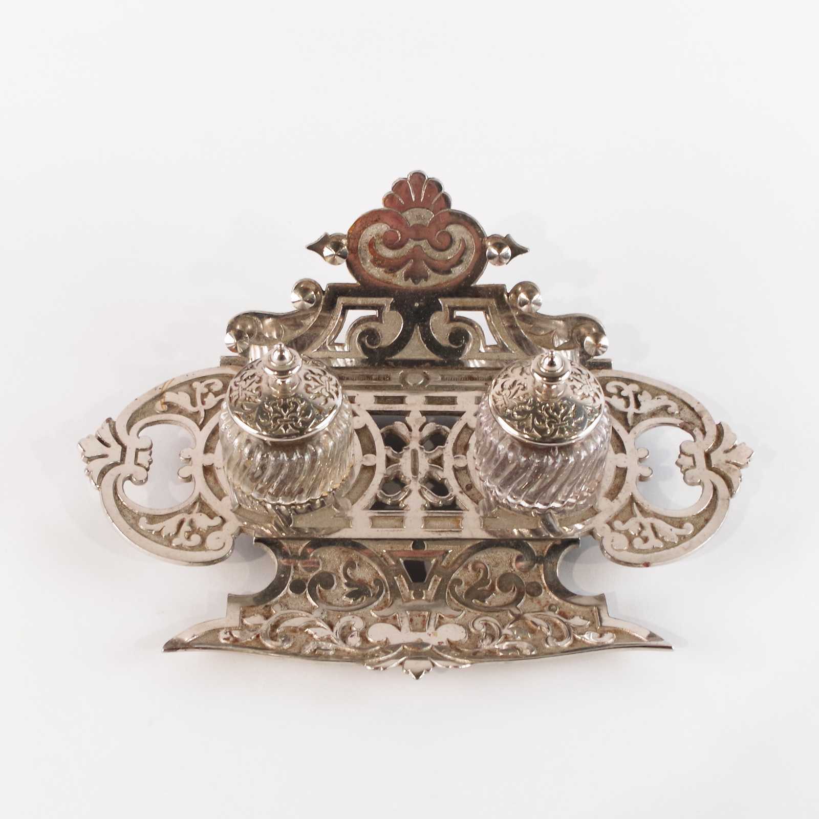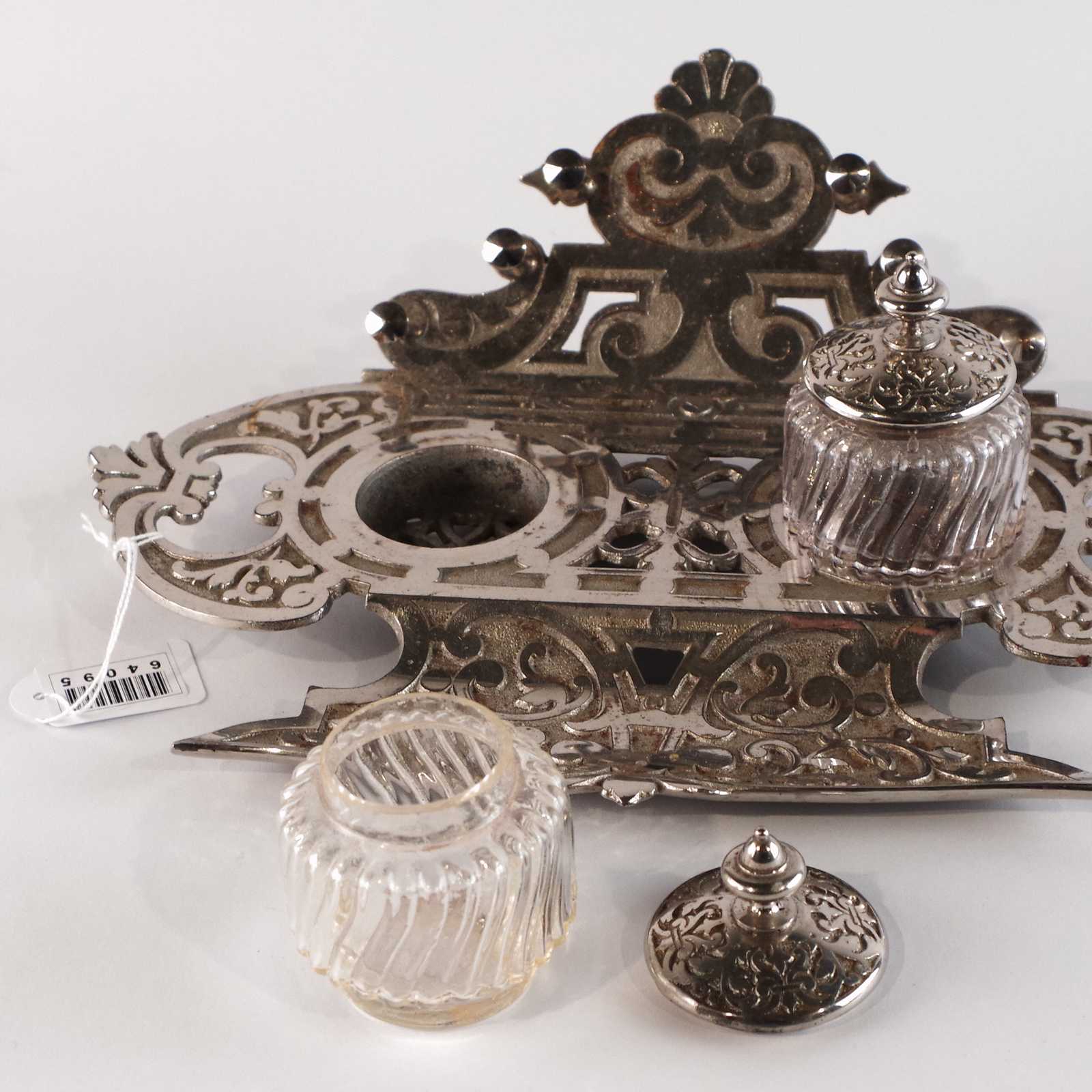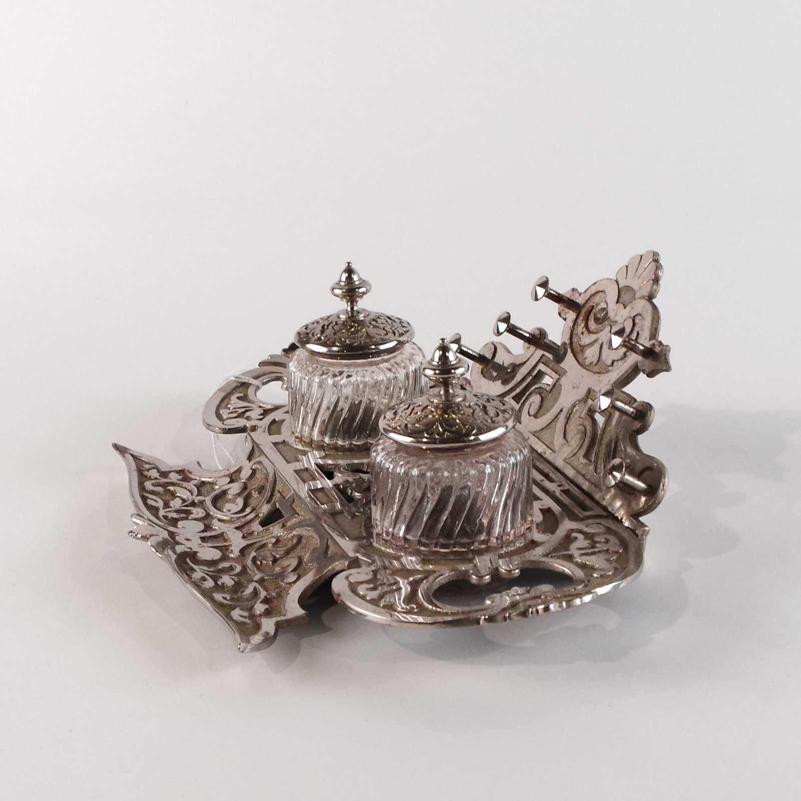 SKRIVSTÄLL glas/vitmetall. Tidigt 1900 tal, jugend. B:28cm.