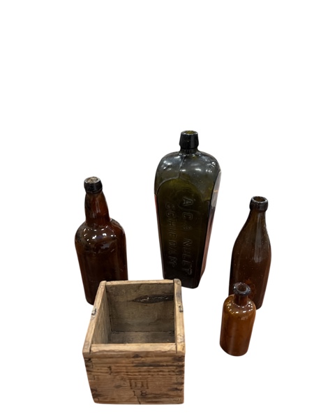 Bilder Äldre Glasflaskor och ett krönt mått i trä