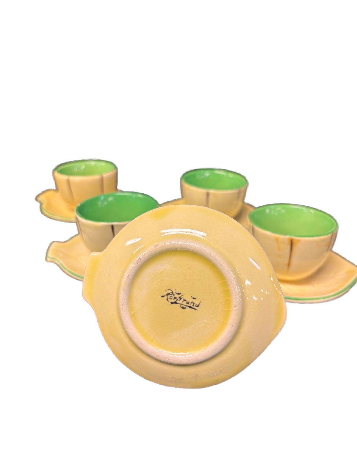 Charmigt set med fem koppar och bladformade fat från Rörstrand, Sverige.Kopparna har en glansig gul utsida med grön insida och svarta dekorlinjer, medan faten är formade som blad med grön kant.
