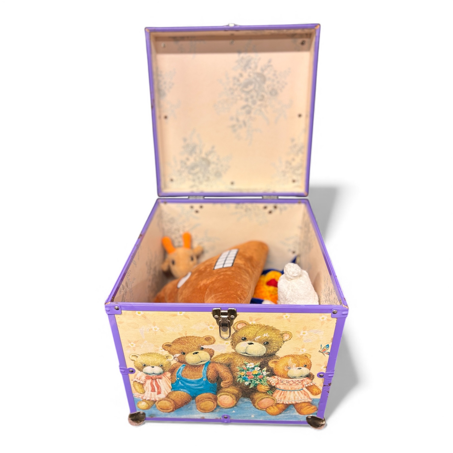 Färgglad och nostalgisk barnkista/leksakskista med charmigt nallemotiv på framsidan.