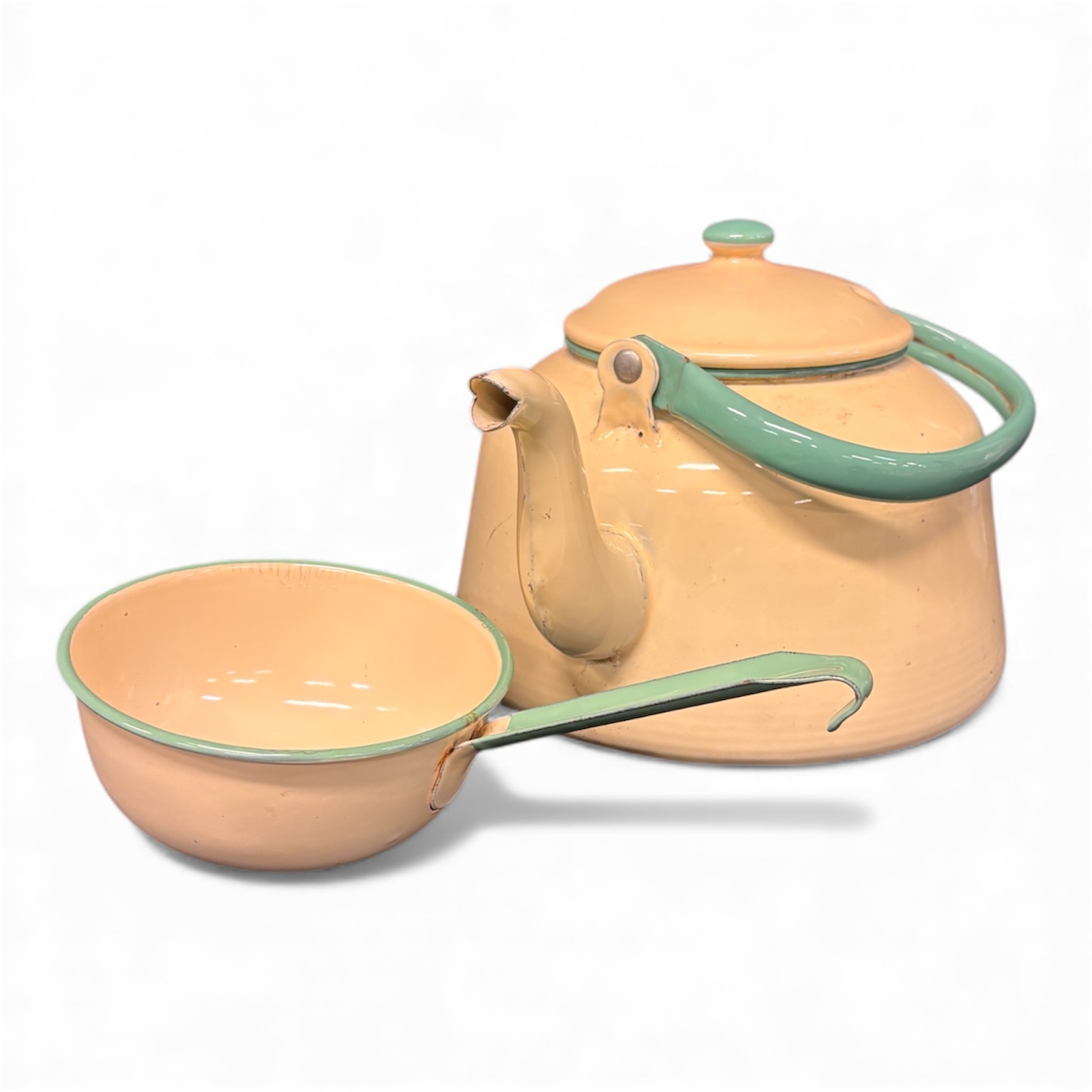 Kockums emaljerad tekanna och kastrull i klassisk beige färg med grön kant, tillverkade i Ronneby, Sverige, troligen 1940–1950-tal.Typiska exempel på Kockums tidlösa hushållsemalj, uppskattade både för sitt formspråk och sitt samlarvärde.