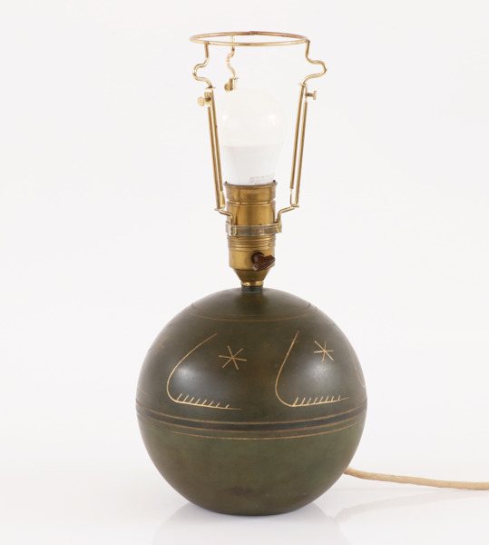 Bronspatinerad mässing. Klotformad. Med graverad dekor. Omärkt.