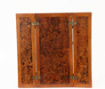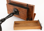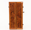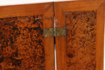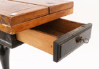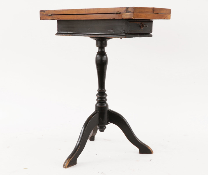 Tredelad skiva, fanerad i björk och alrot. Gångjärn i mässing. Svarvad, tredelad fot. En låda. Nyckel finns.