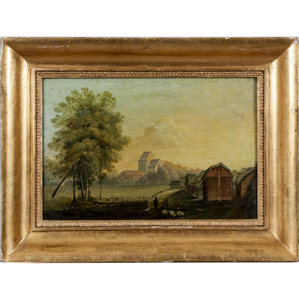 Figurscen med Gamla Uppsala kyrka i bakgrunden. Olja på duk. Osignerad. Betitlad a tergo "Gamla Uppsala". Samtida ram.