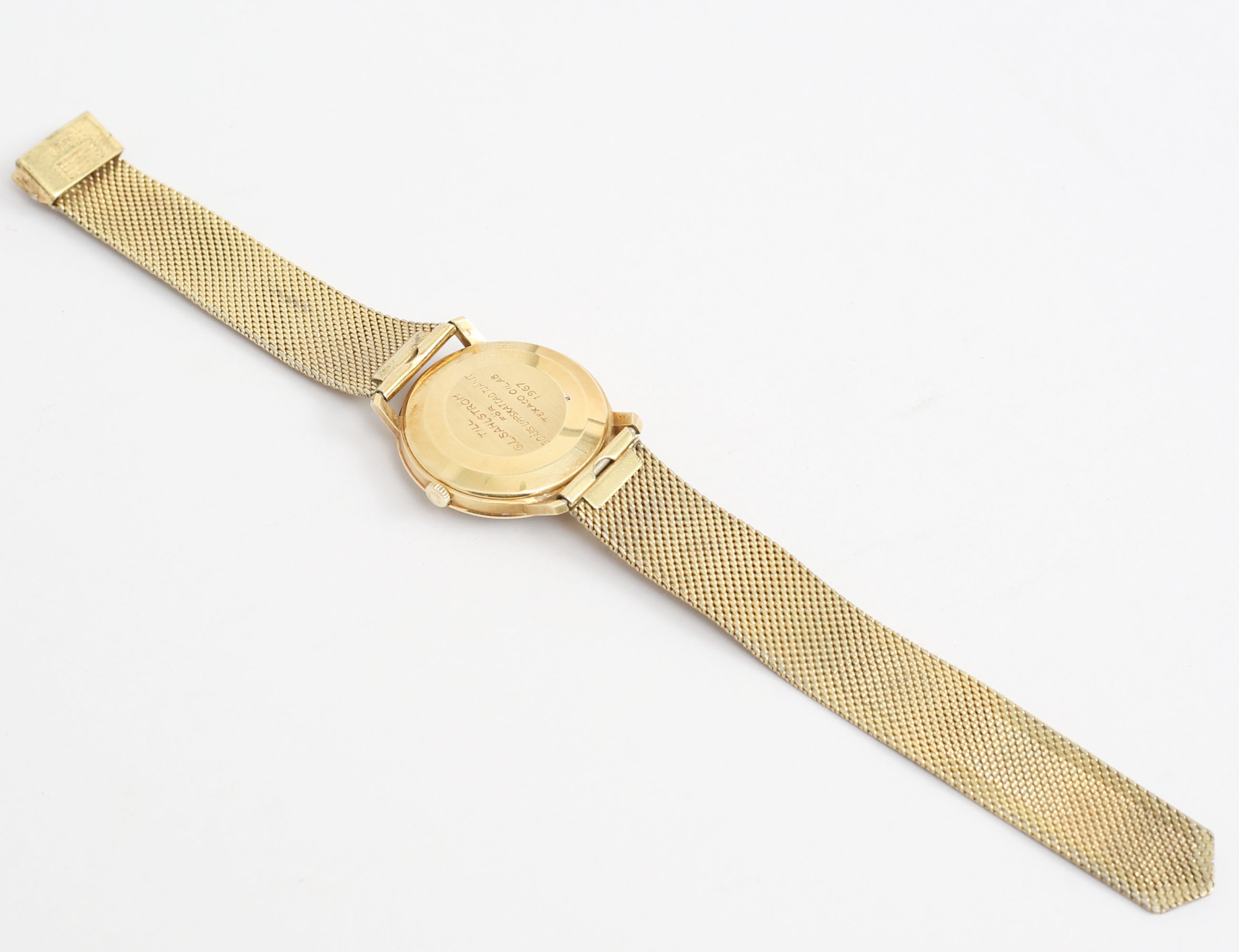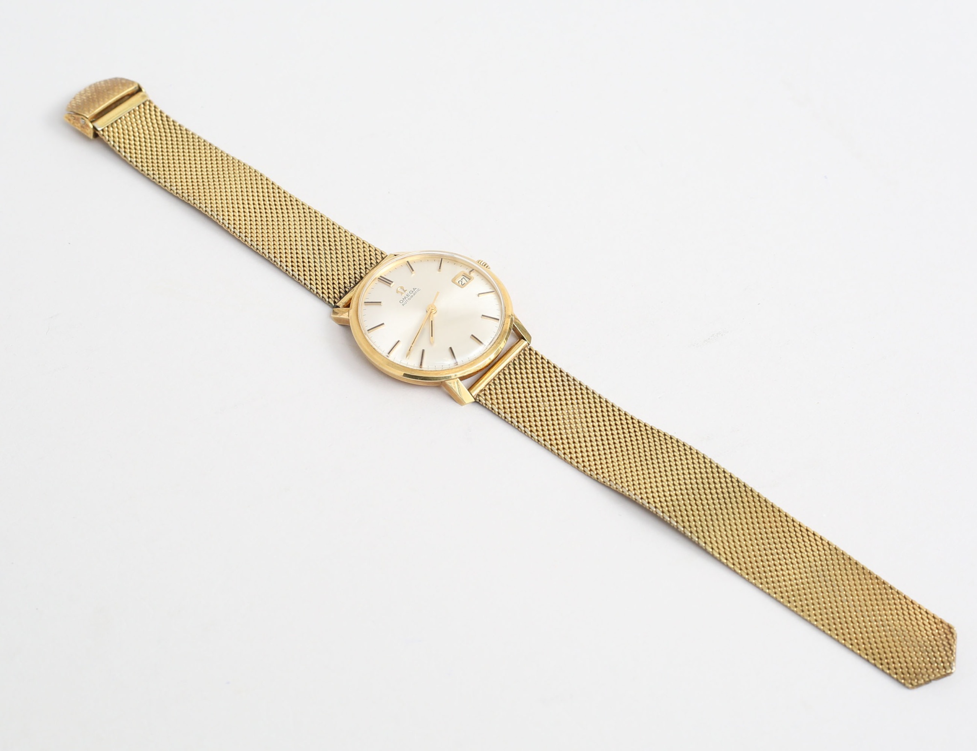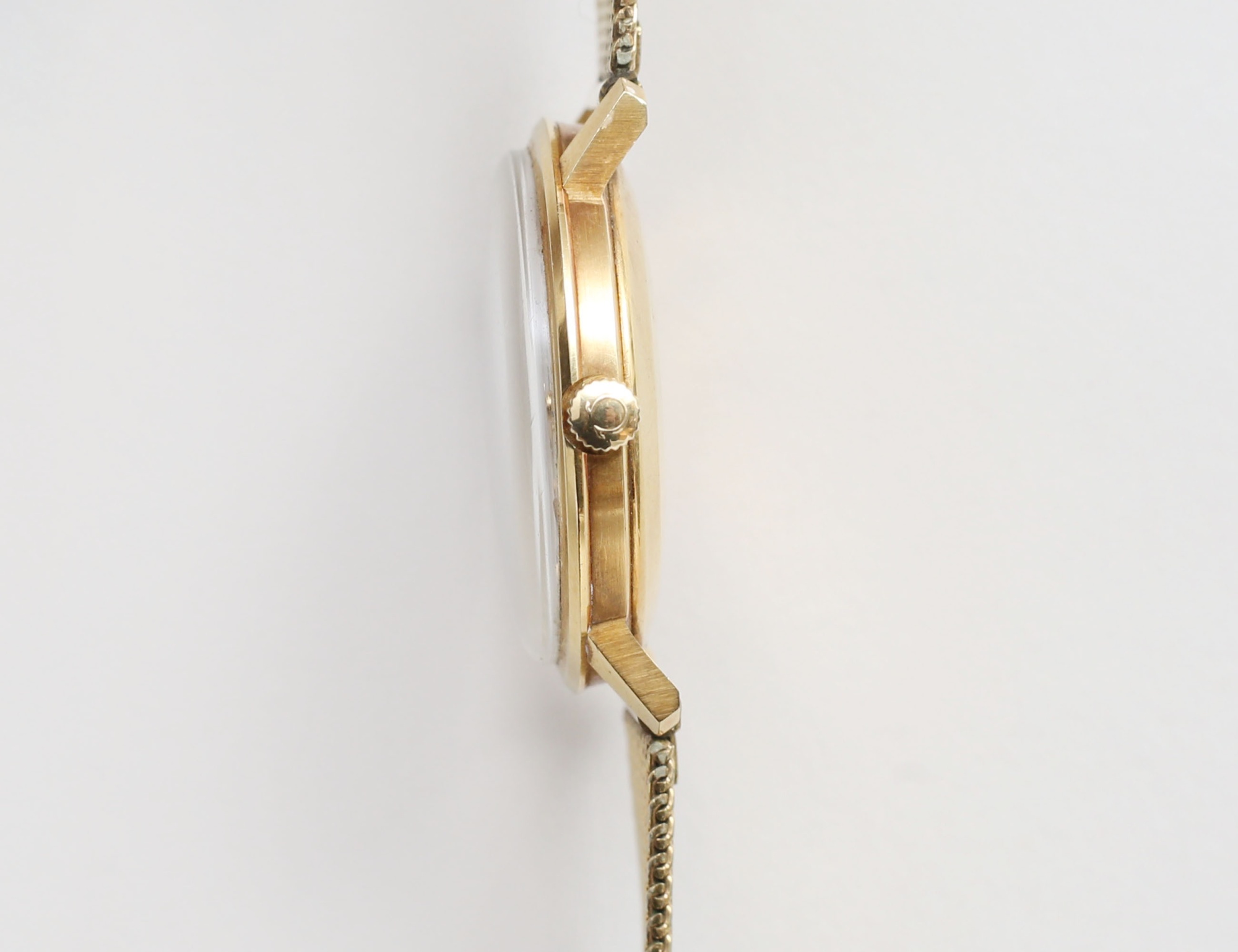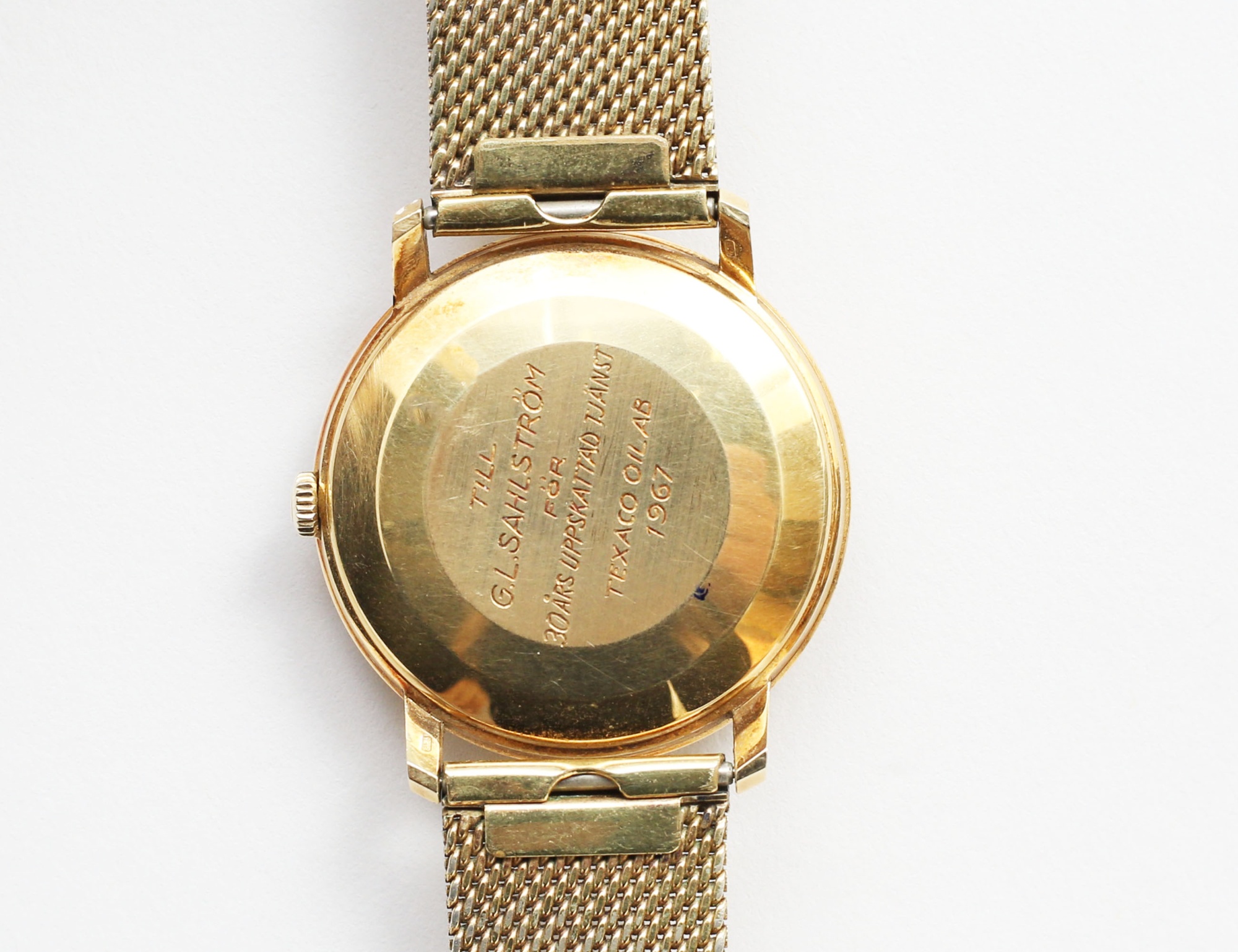 boetten 18k, diameter 34 mm., safirglas, ljus urtavla med datumvisning, länk i gulddoublé, fungerar vid katalogiseringstillfället (bakboett med gåvogravyr)