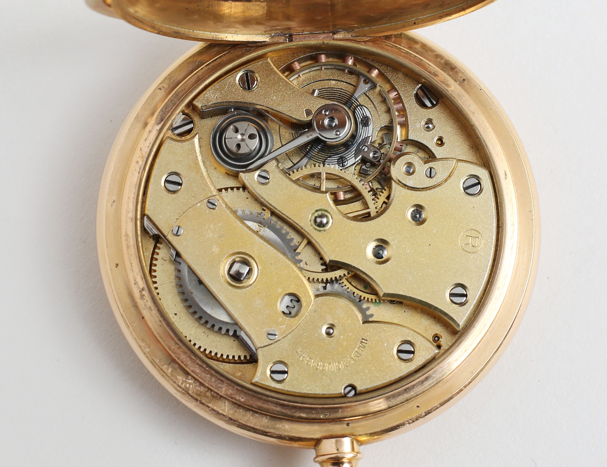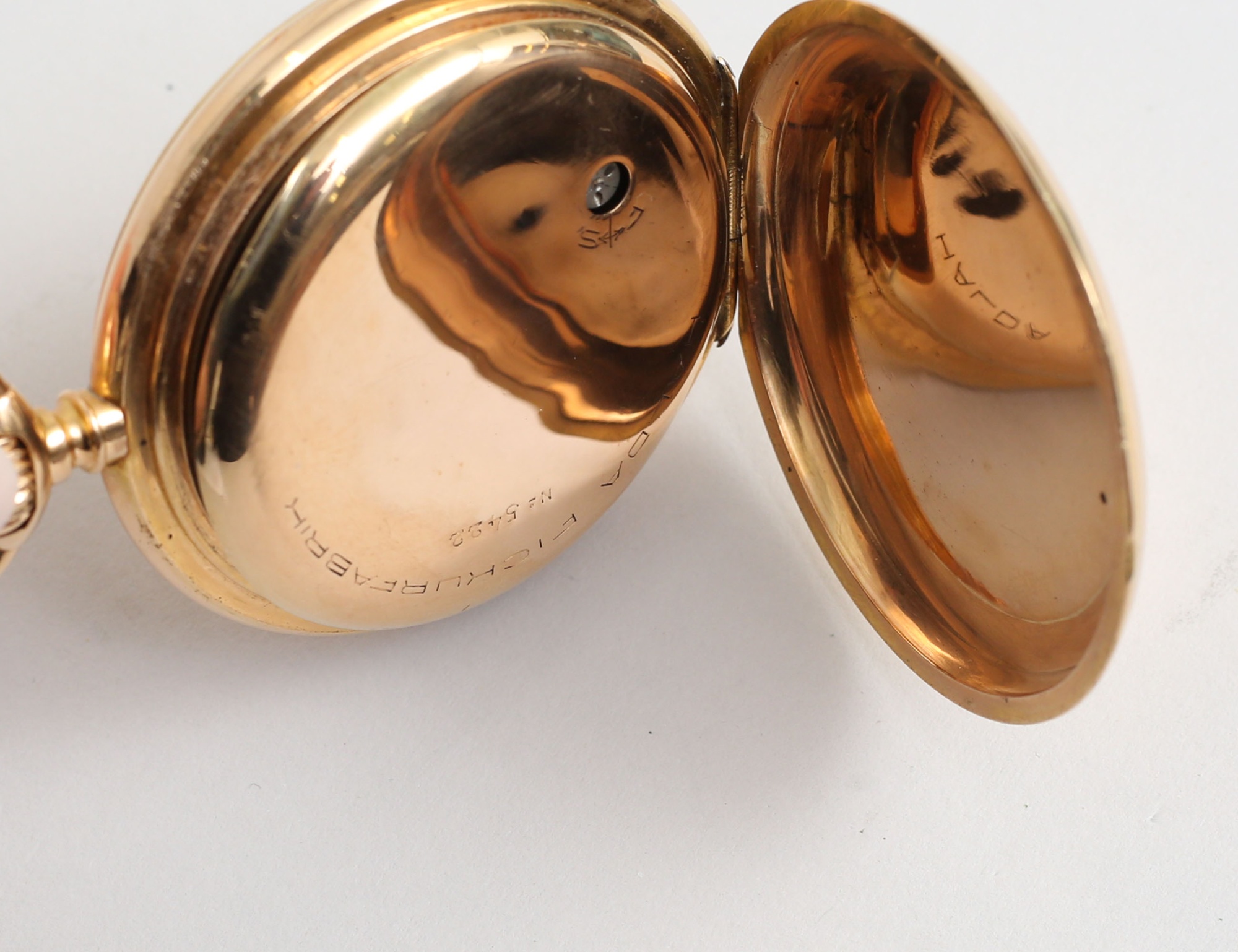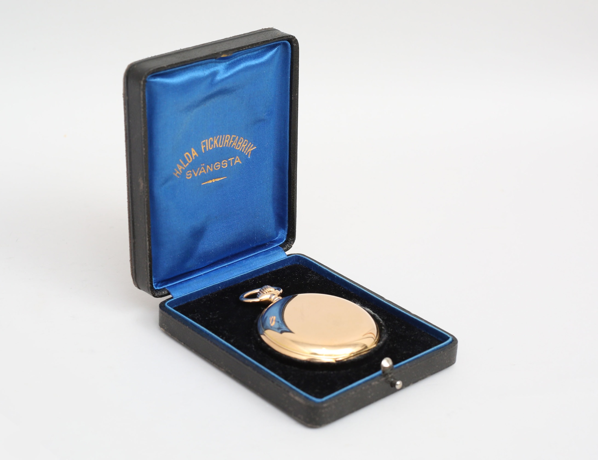 diameter 52,5mm., även 18k i innerboetten, boetten stämplad 1899, fungerar vid katalogiseringstillfället, märkt Haldas Fickursfabrik, mycket gott originalskick, originaletui, bruttovikt 120 gram
