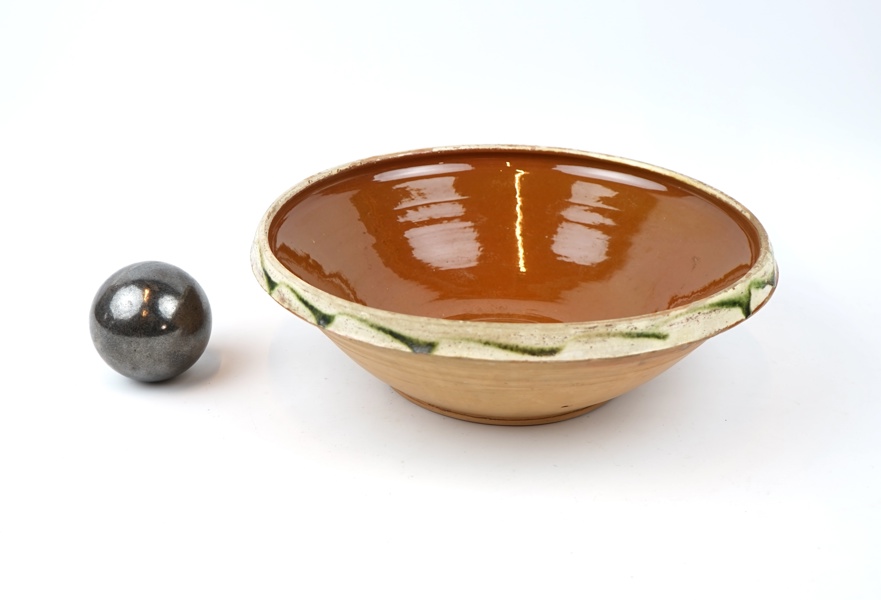 Bilder Senapskula och skål, metall/keramik, senapskula från Skultuna.