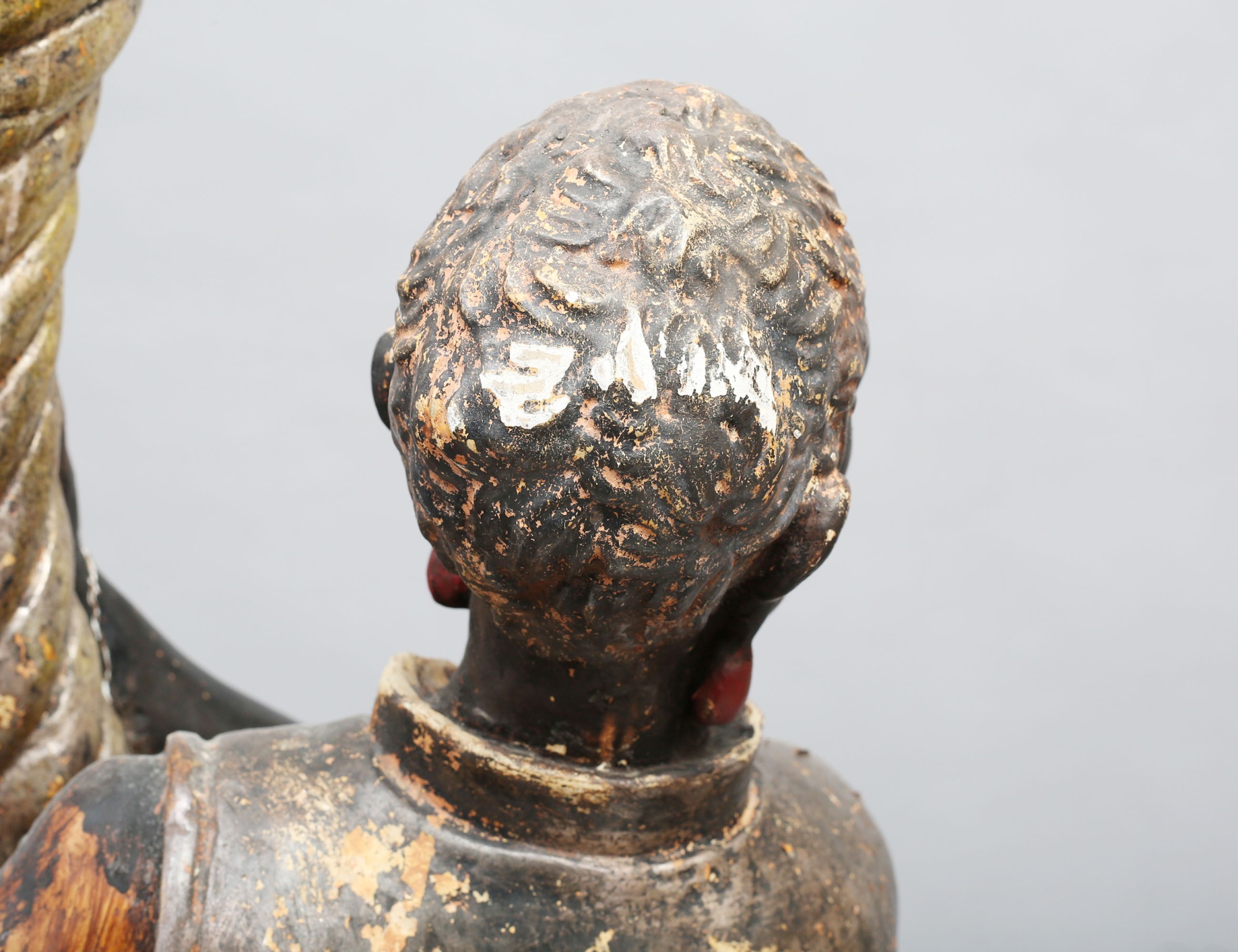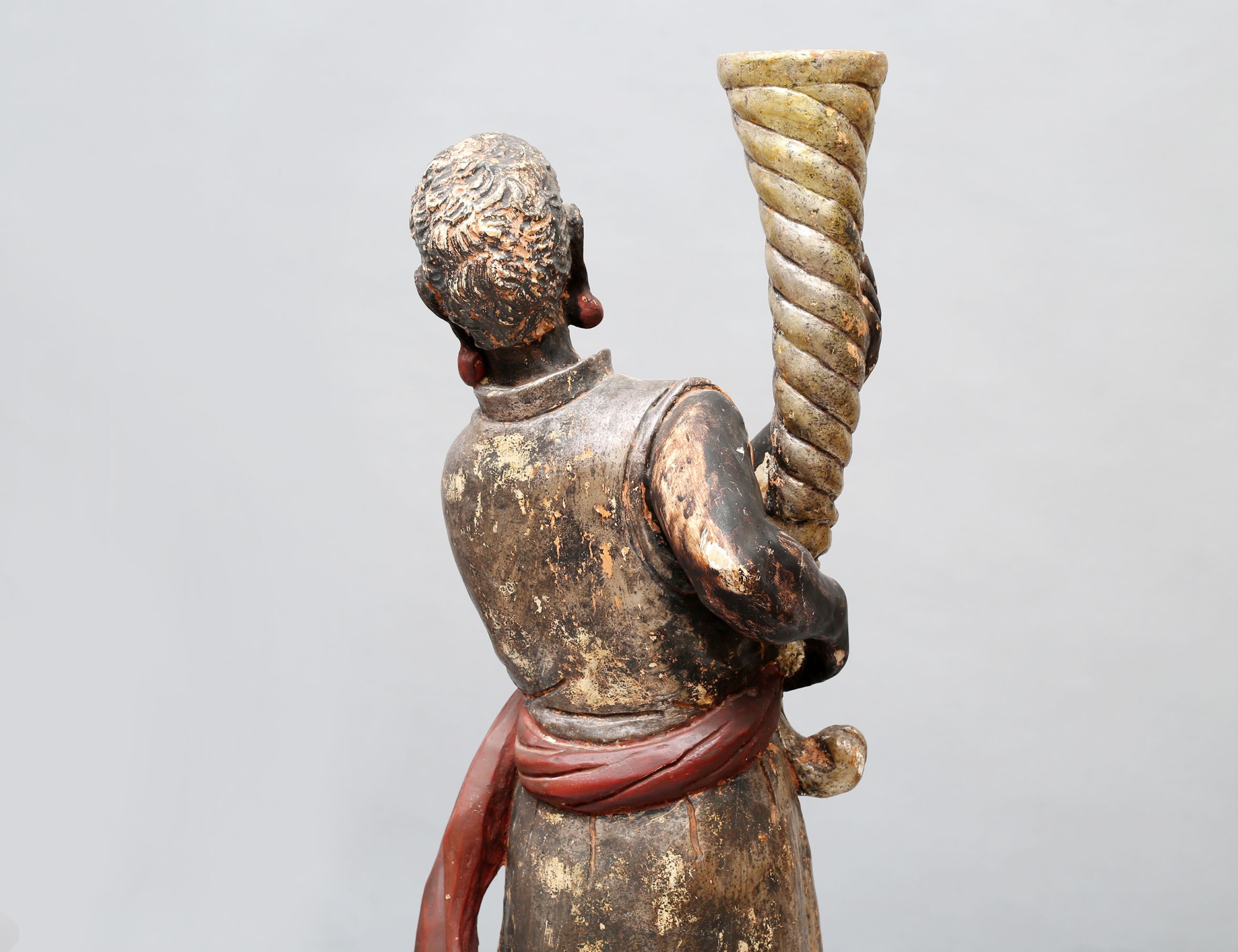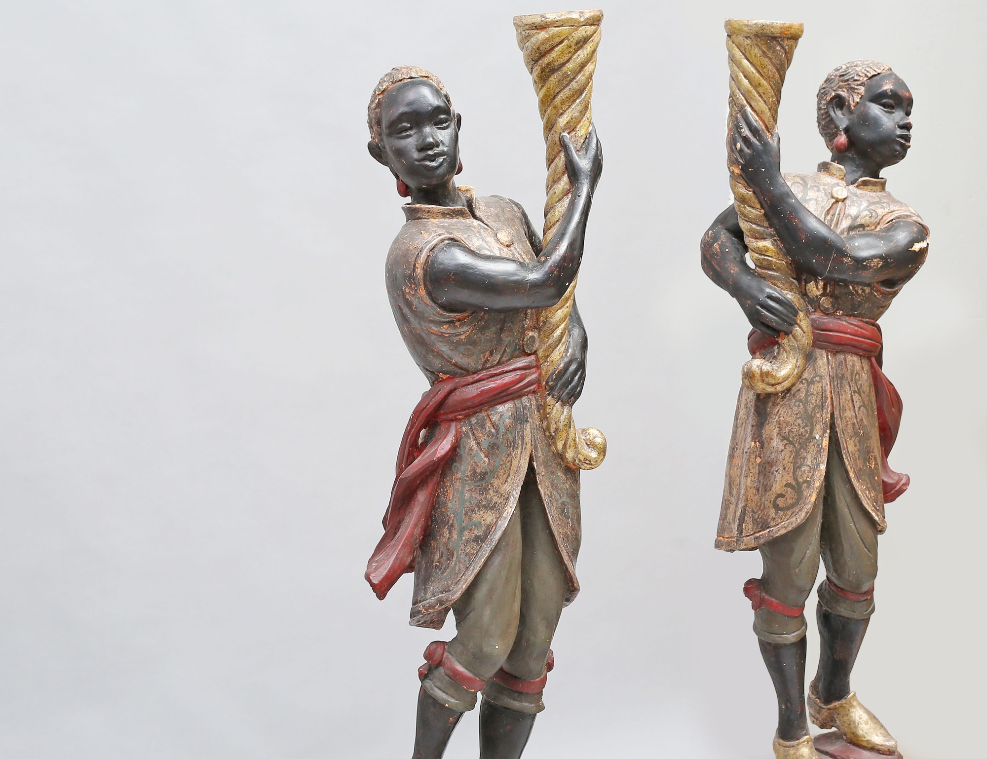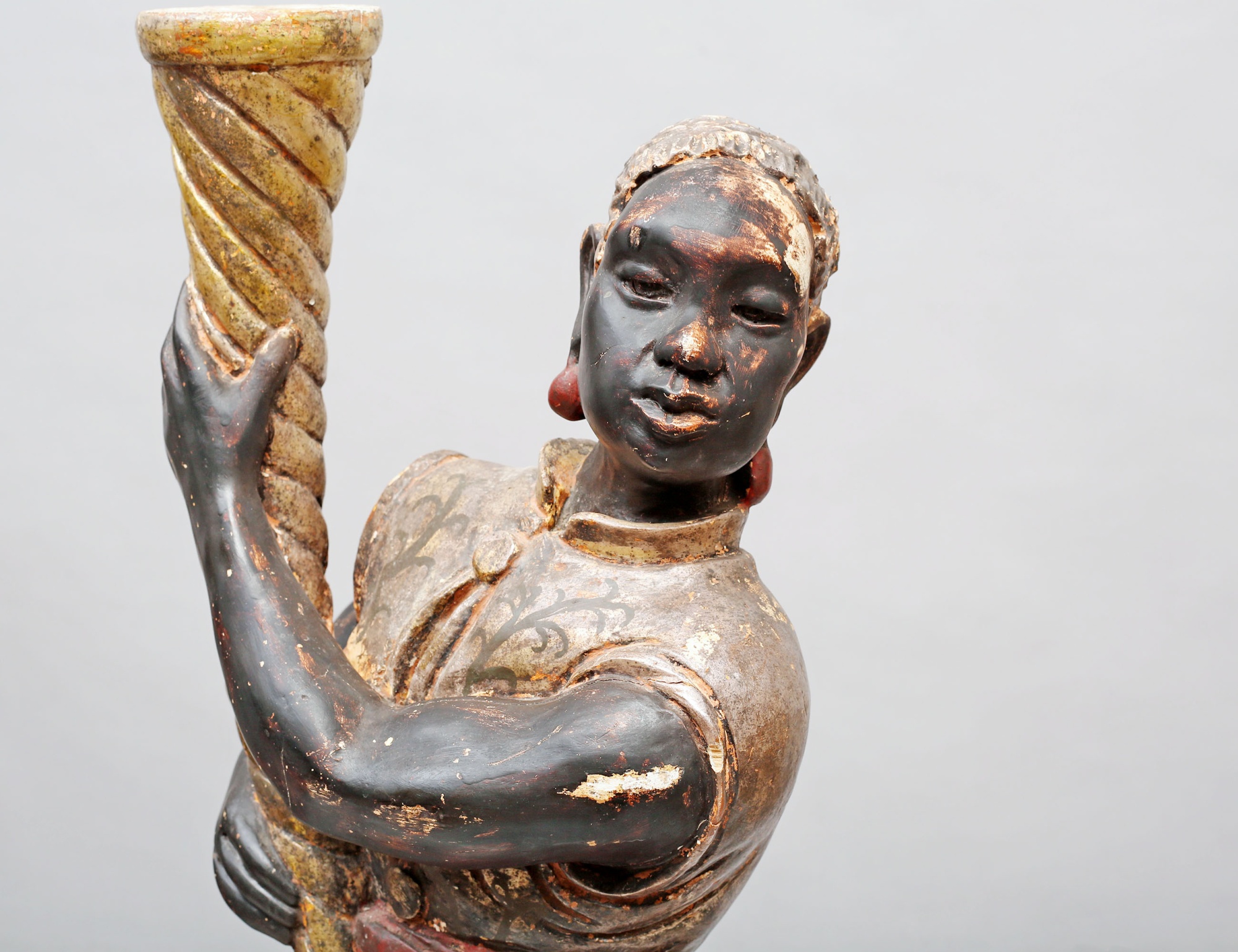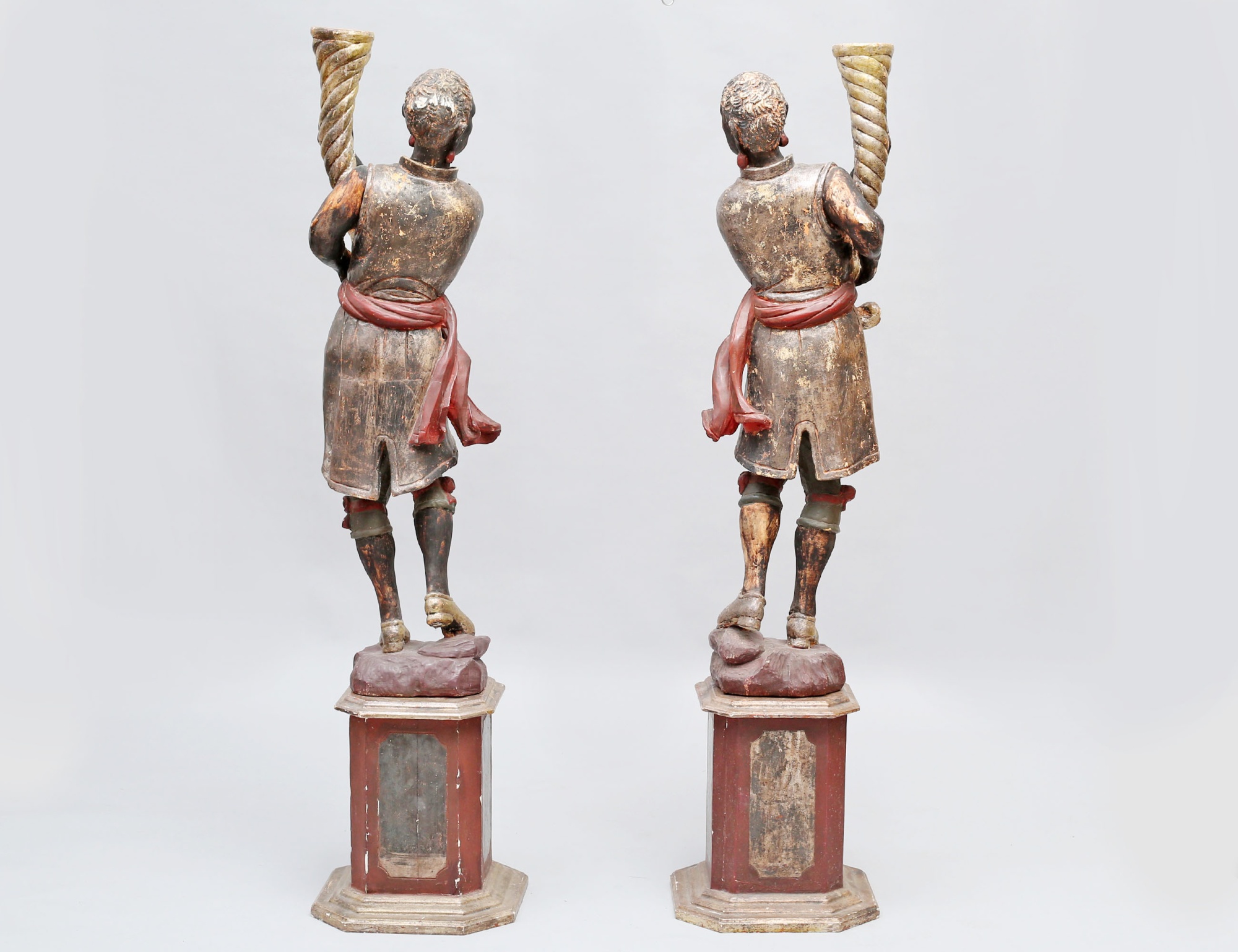fackelbärare i form av morianer, skulpterat förgyllt och polykromt bemålat trä med gipsgrundering, monterade på oktagonalt fundament, höjd 153 ( dekorbortfall, sprickor, en arm med bräckage)