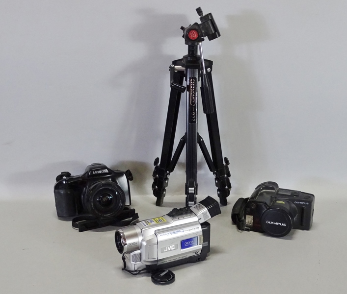 Bilder 3 st. kameror samt kamerastativ, Minolta, Olympus samt JVC