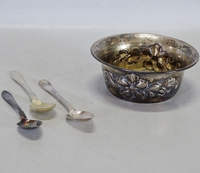 dekor av blommor i relief, 3 st skedar i silver medföljer, vikten är ink. skedar