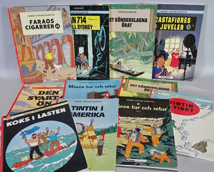 Bilder 11 st. seriealbum "Tintin" Carlsen Comics och Tintins äventyrsklubb, 1980-tal