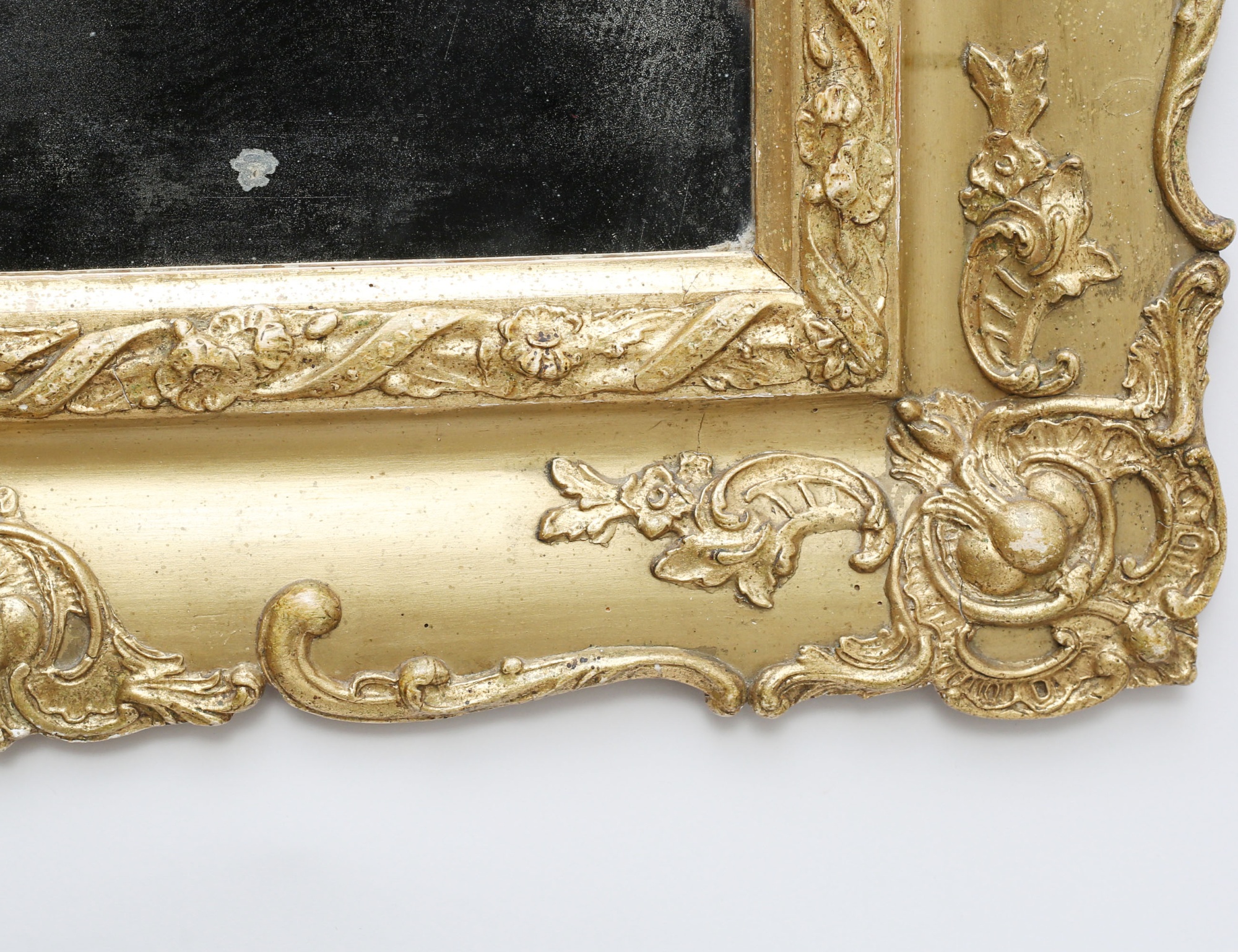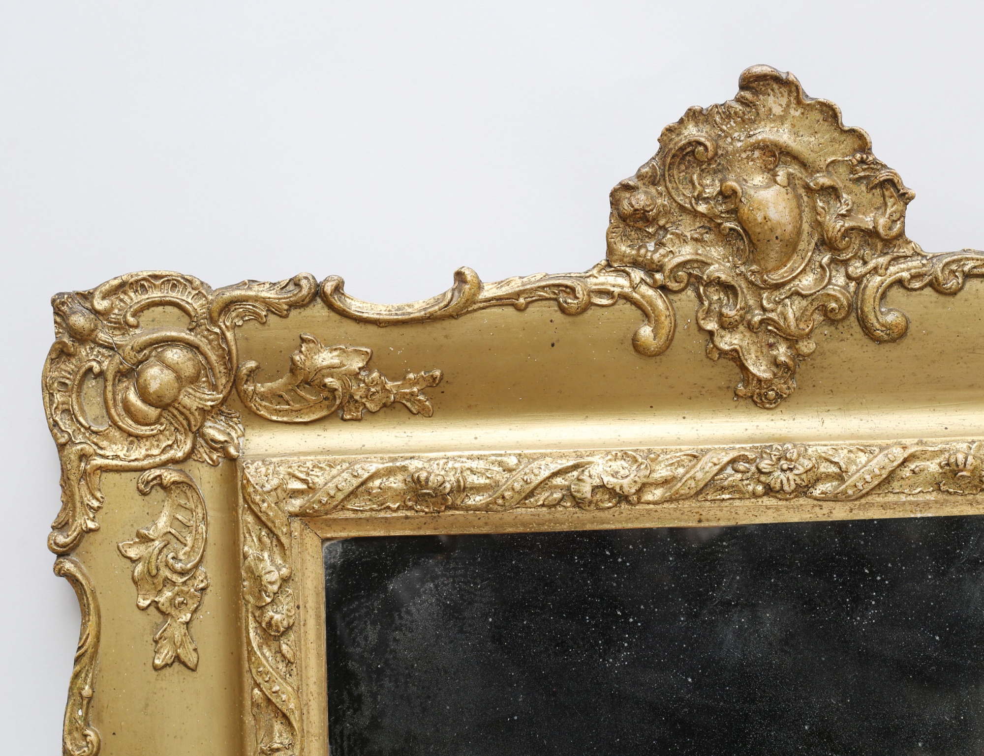 reliefdekor av rocailler och akantus, uppsvängt krön, förgylld, samtida glas, 60x68