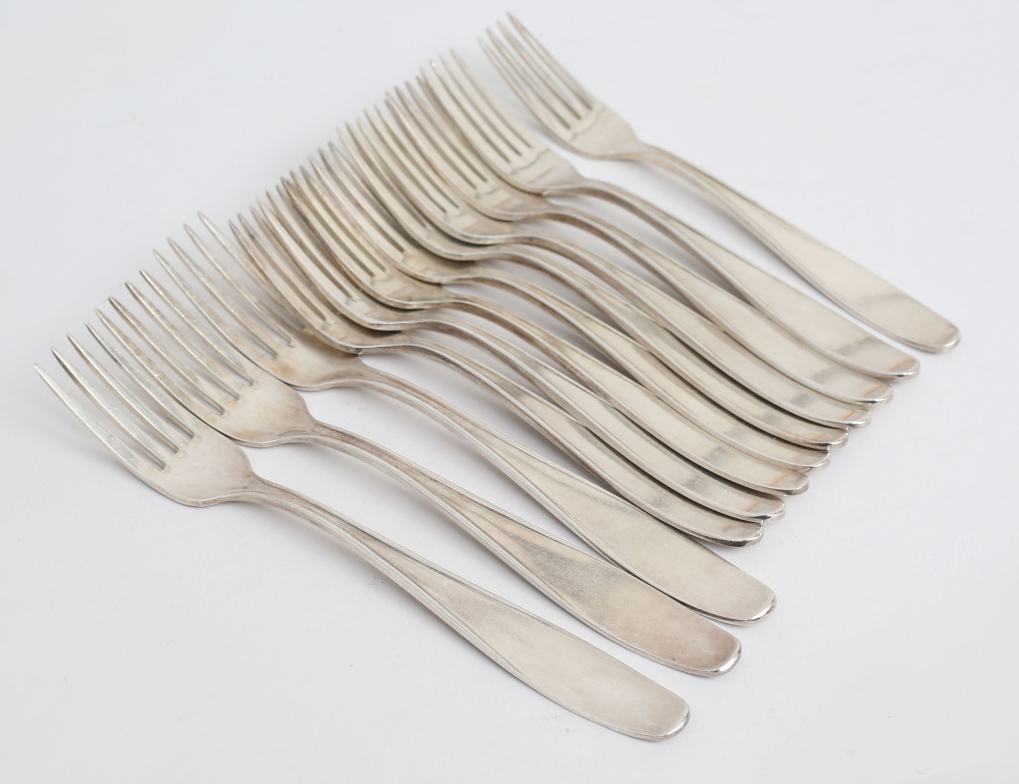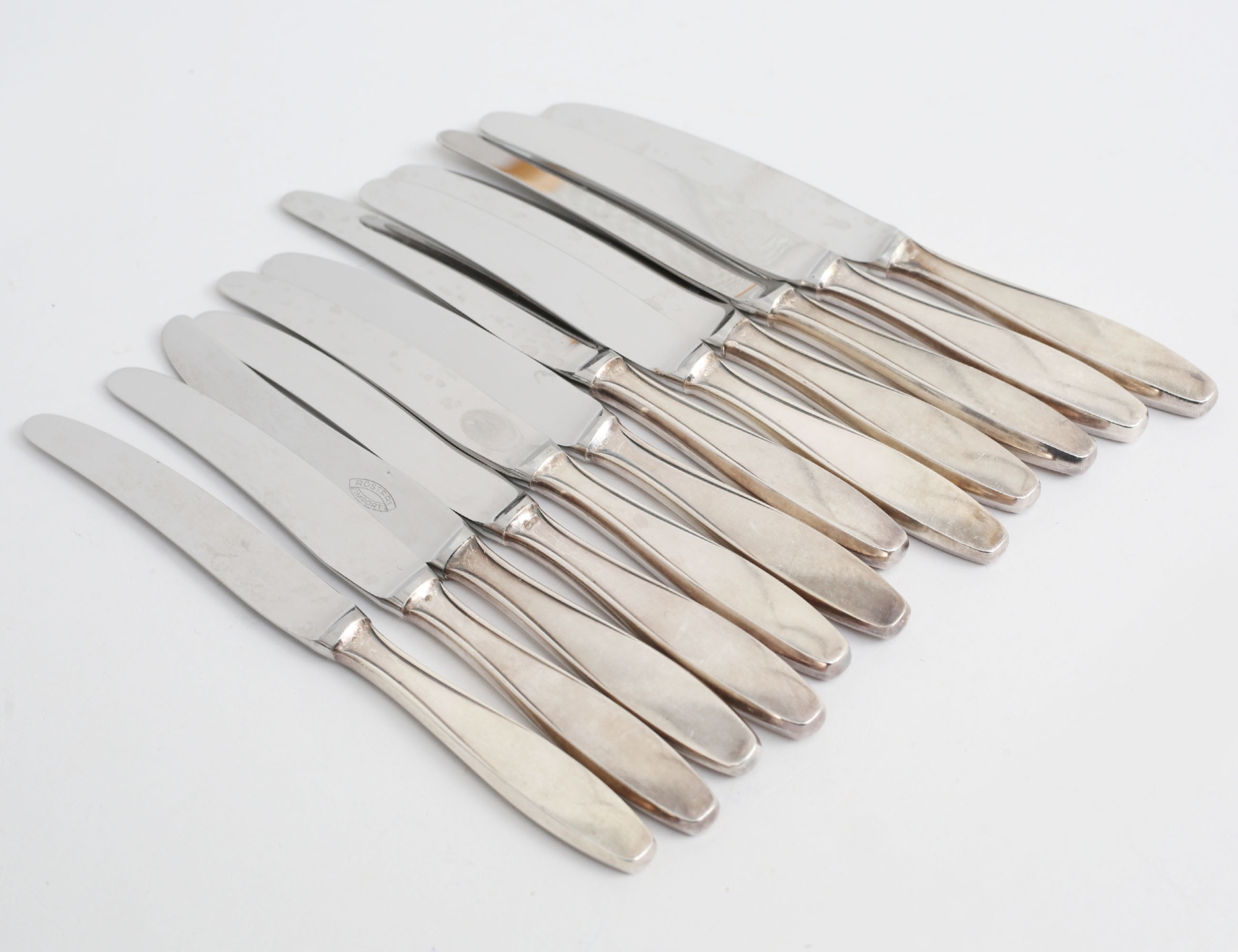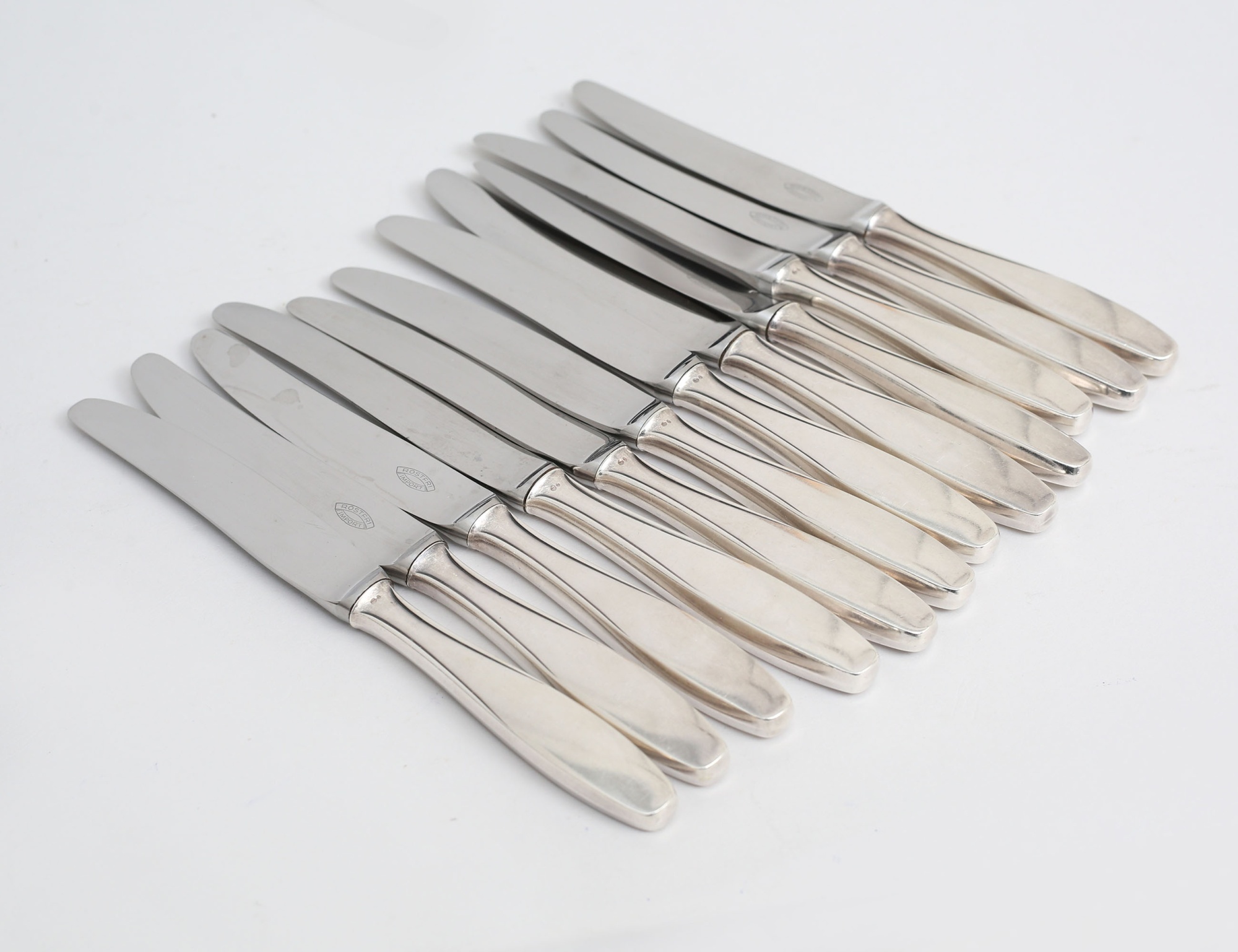 svenska importstämplar 1958, slät modell, 12 bordsgafflar, 12 bordsknivar, 12 bordsskedar, 12 förrättsknivar, 12 förrättsgafflar samt 11 kaffeskedar, vikt 1359 gram exklusive knivar, längd 9-20
