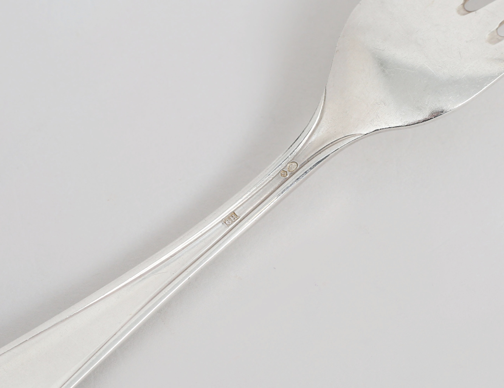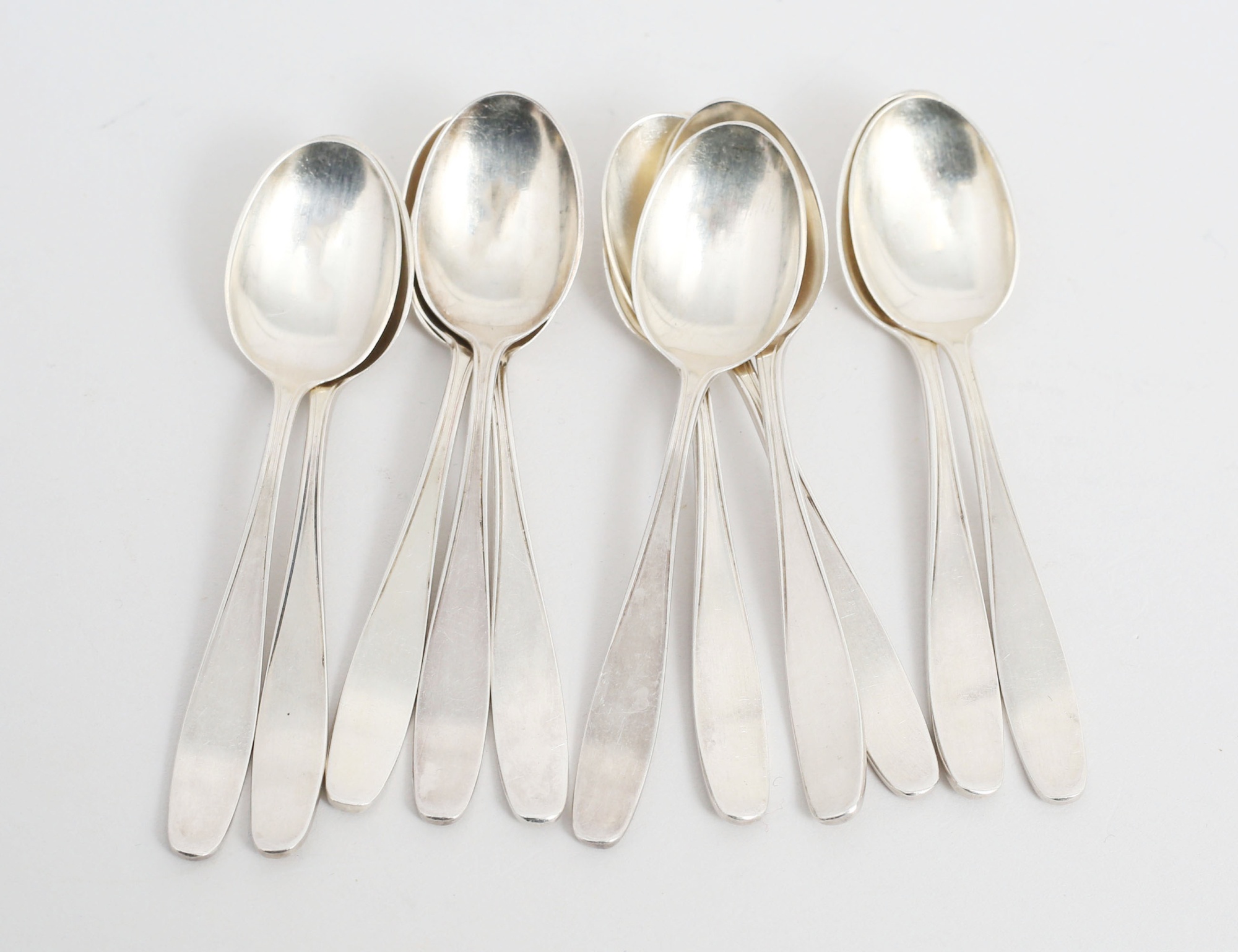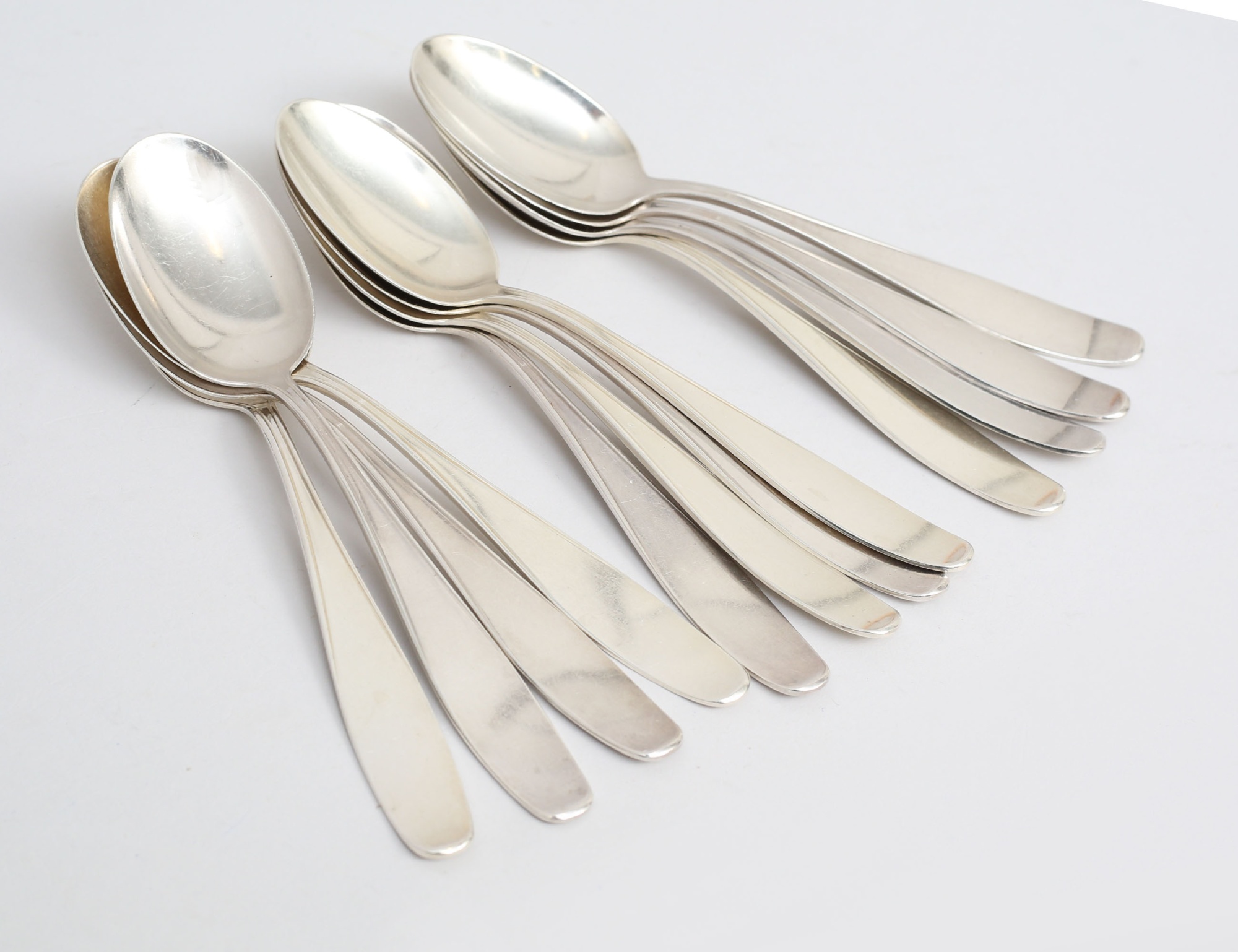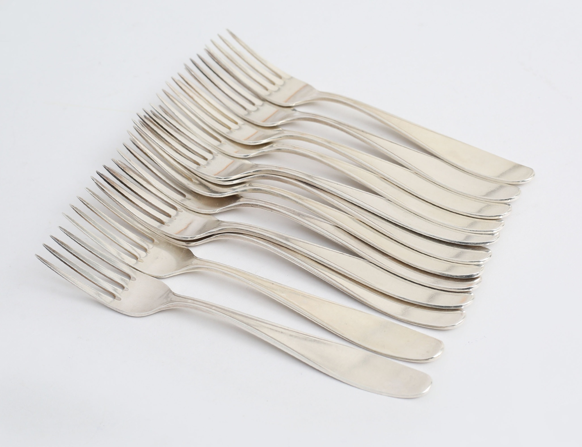 svenska importstämplar 1958, slät modell, 12 bordsgafflar, 12 bordsknivar, 12 bordsskedar, 12 förrättsknivar, 12 förrättsgafflar samt 11 kaffeskedar, vikt 1359 gram exklusive knivar, längd 9-20
