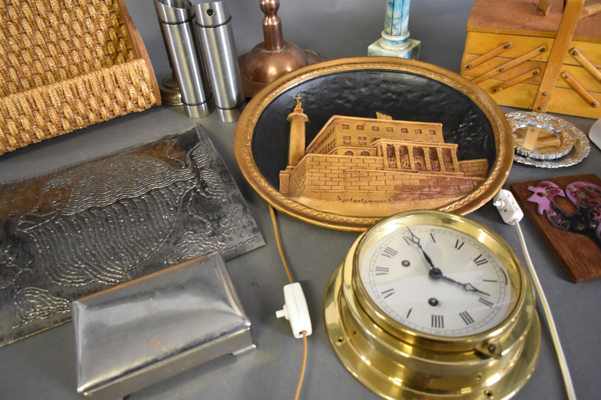 Bilder Parti bordslampor, skeppsklocka och syskrin med innehåll, högsta höjd 63 cm