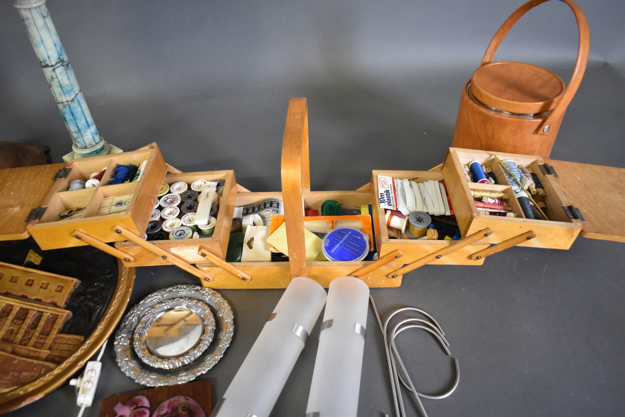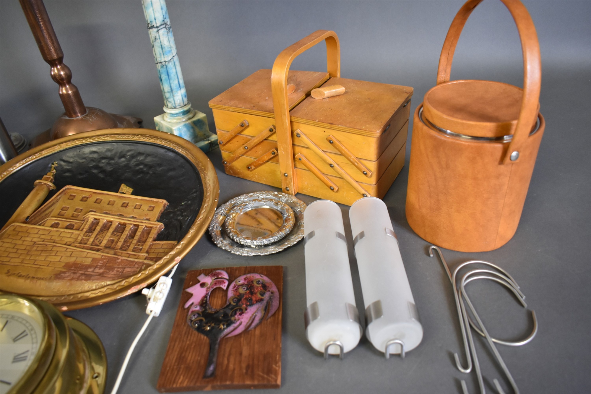 Parti bordslampor, skeppsklocka och syskrin med innehåll, högsta höjd 63 cm