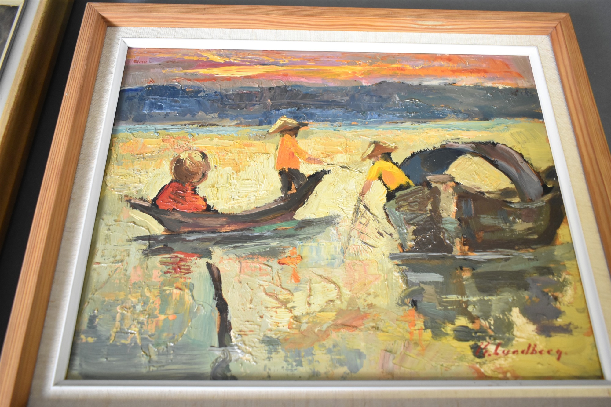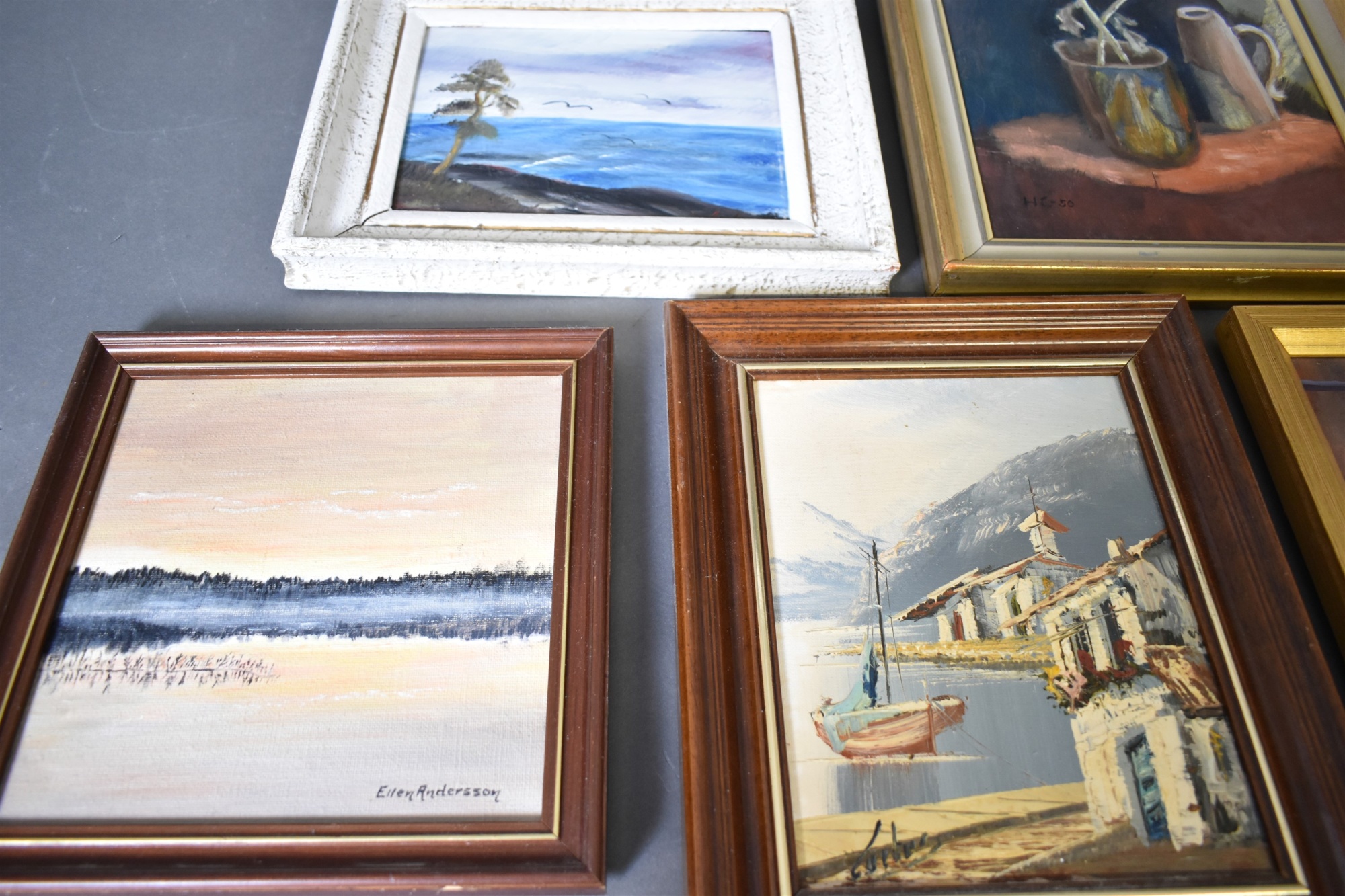 Bilder Parti tavlor 7 st, oljor på duk och pannå bla Kurt Lundberg, största mått 44x36 cm