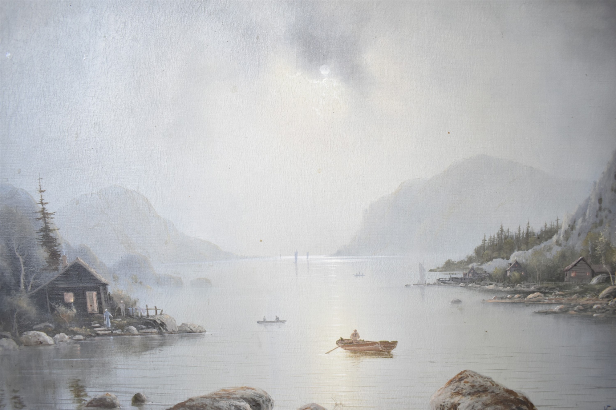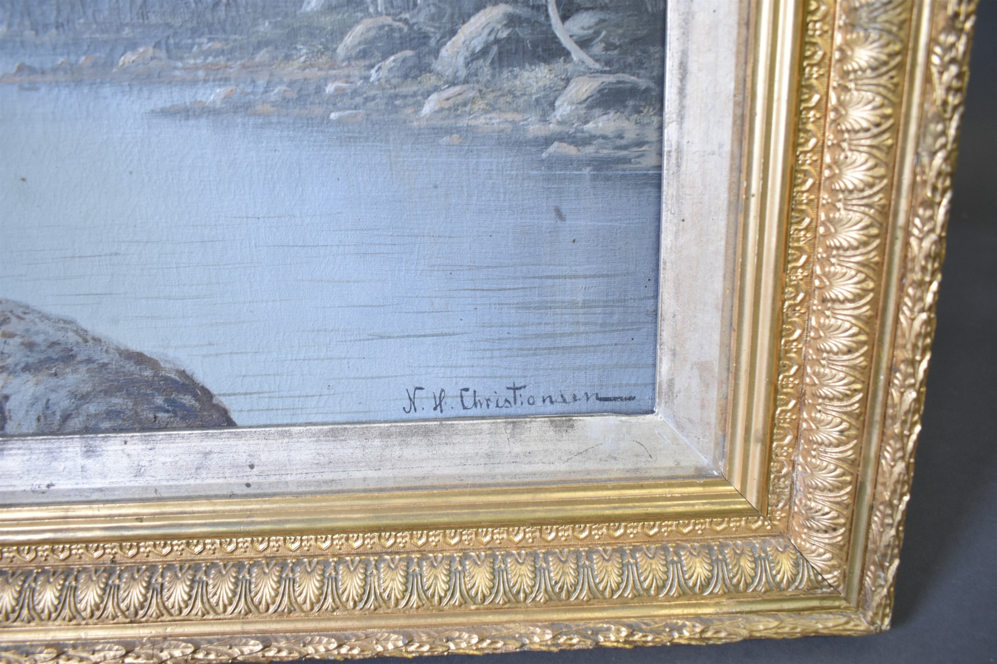 Bilder N.H Christiansen olja på duk, Båtar i vik, mått 110 x 80 cm